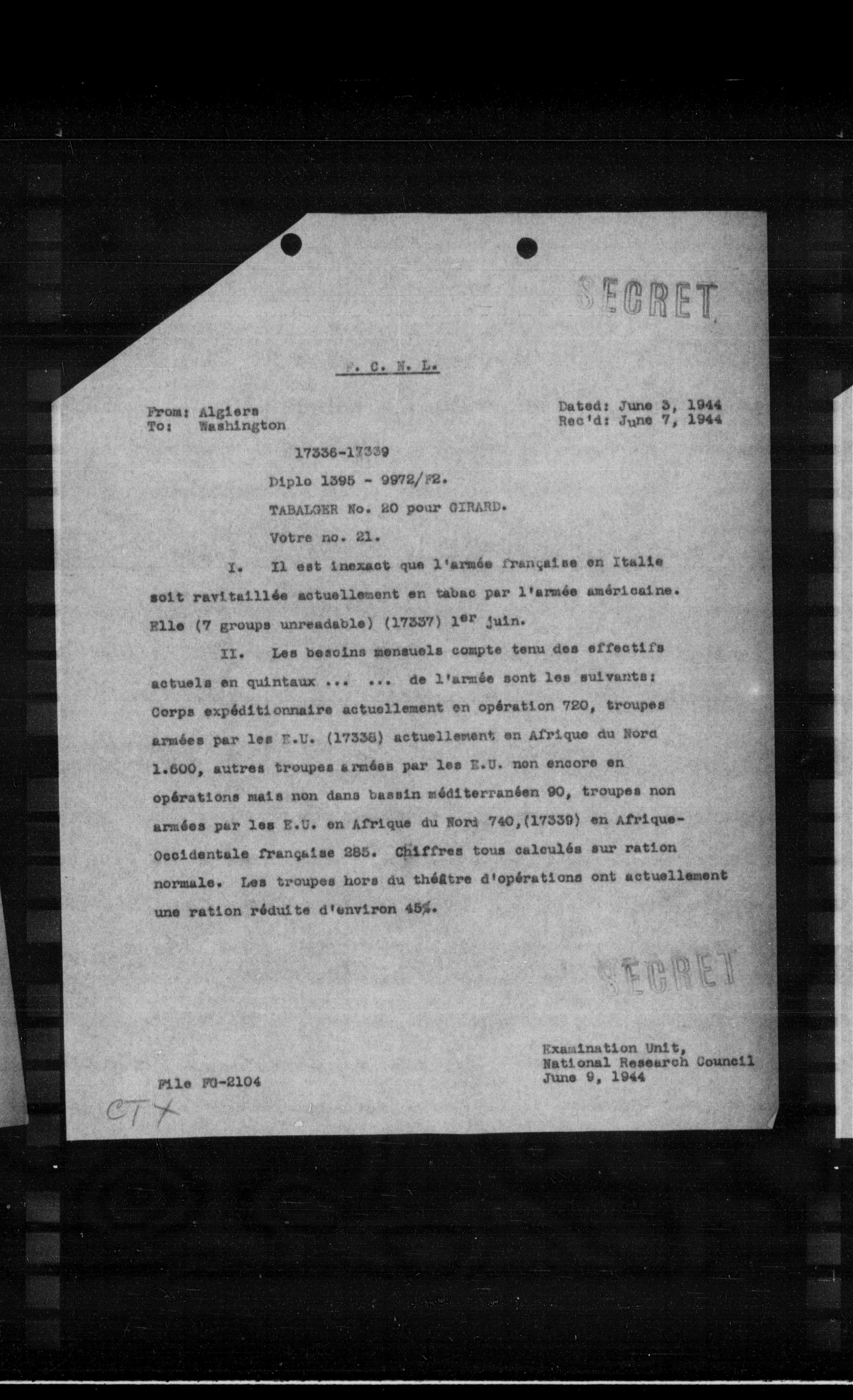 I. Il est inexact que l'armée française en Italie soit ravitaillée actuellement en tabac par l'armée américaine. Elle (7 groupes unreadables) (17337) 1er juin.