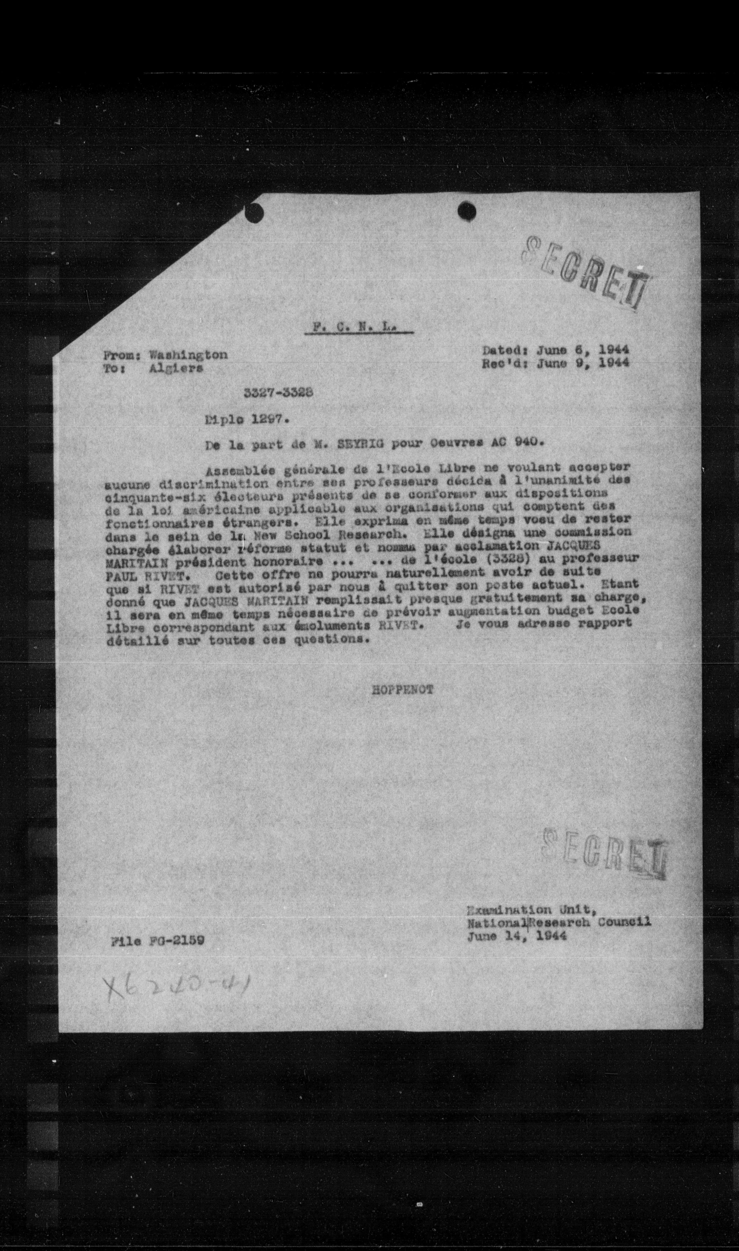 Assemblée générale de l'Ecole Libre ne voulant accepter aucune discrimination entre ses professeurs décida a l'unanimite des cinquante-six électeurs présents de se conformer aux dispositions de la loi anéricaine applicable aux organisations qui comptent des fonctionnaires étrangers. Elle exprima en même temps voeu de rester dans le sein de la. New School Research. Elle désigna une commission chargée élaborer réforme statut et nomma par acclamation JAGGES MARITAIN président honoraire ... de l'école (3328) au professeur PAUL RIVET. Cette offre ne pourra naturellement avoir de suite que si RIVET est autorisé par nous à quitter son poste actual. Etant donné que JAGGES MARITAIN remplissait presque gratuitement sa charge, il sera en même temps nécessaire de prévoir augmentation budget Ecole Libre correspondant aux émoluments RIVET. Je vous adressee rapport détaillé sur toutes ces questions.