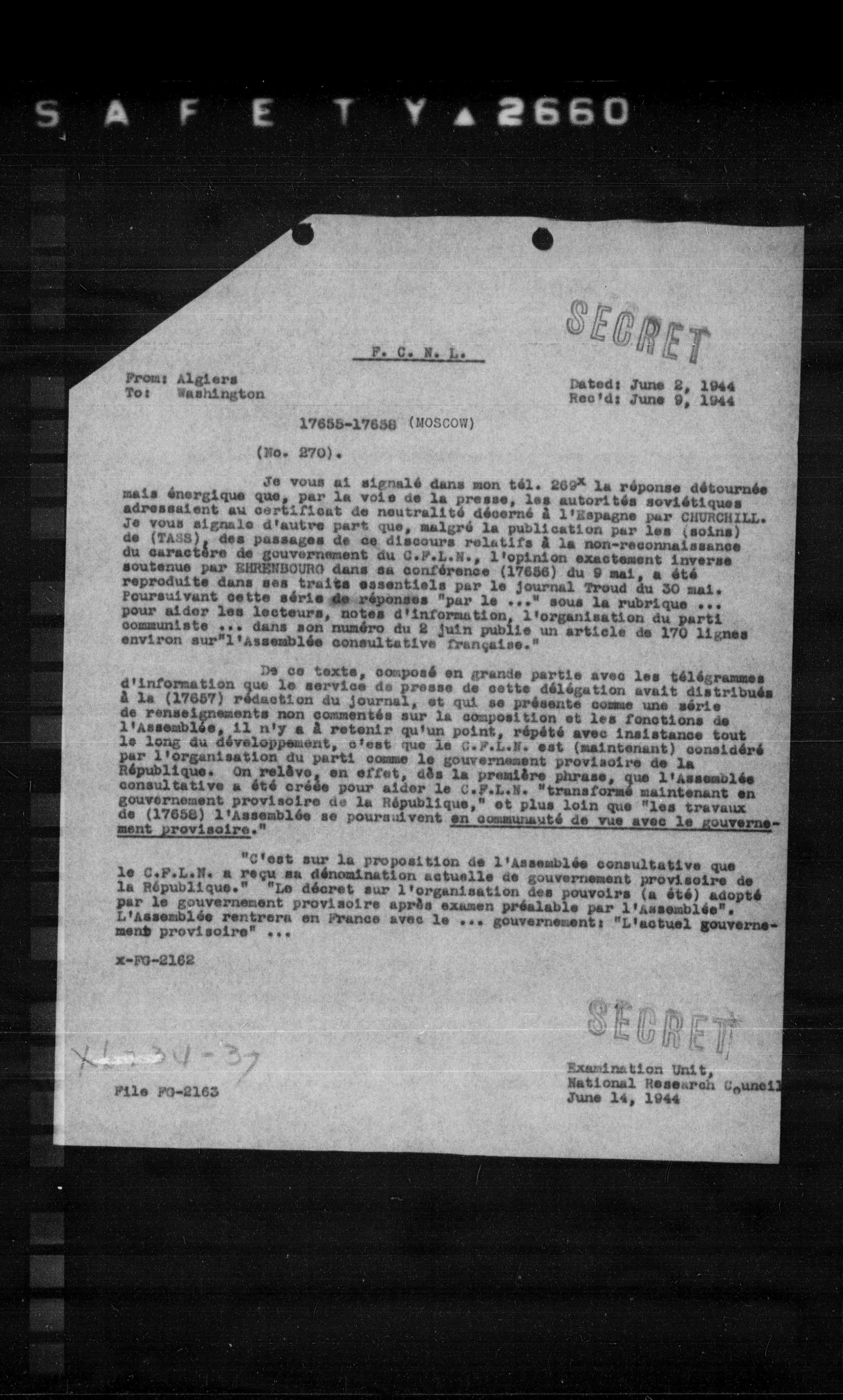 Je vous ai signalé dans mon tél. 260° la réponse détournée mais énergique que, par la voie de la presse, les autorités soviétiques adressaient au certificat de neutralité décerné à l'Espagne par **CHURCHILL**. Je vous signais d'autre part que, malgré la publication par les (soins) de (TASS), des passages de ce discours relatifs à la non-reconnaissance du caractère de gouvernement du **C.P.L.N.**, l'opinion exactement inverse soutenue par **SUBERBOURO** dans sa conférence (17658) du 9 mai, a été reproduite dans ses traits essentiels par le journal *Troué* du 30 mai. Poursuivant cette série de réponses "par le ..." sous la rubrique ... pour aider les lecteurs, notes d'information, l'organisation du parti communiste ... dans son numéro du 2 juin public un article de 170 lignes environ sur "l'Assemblée consultative française."