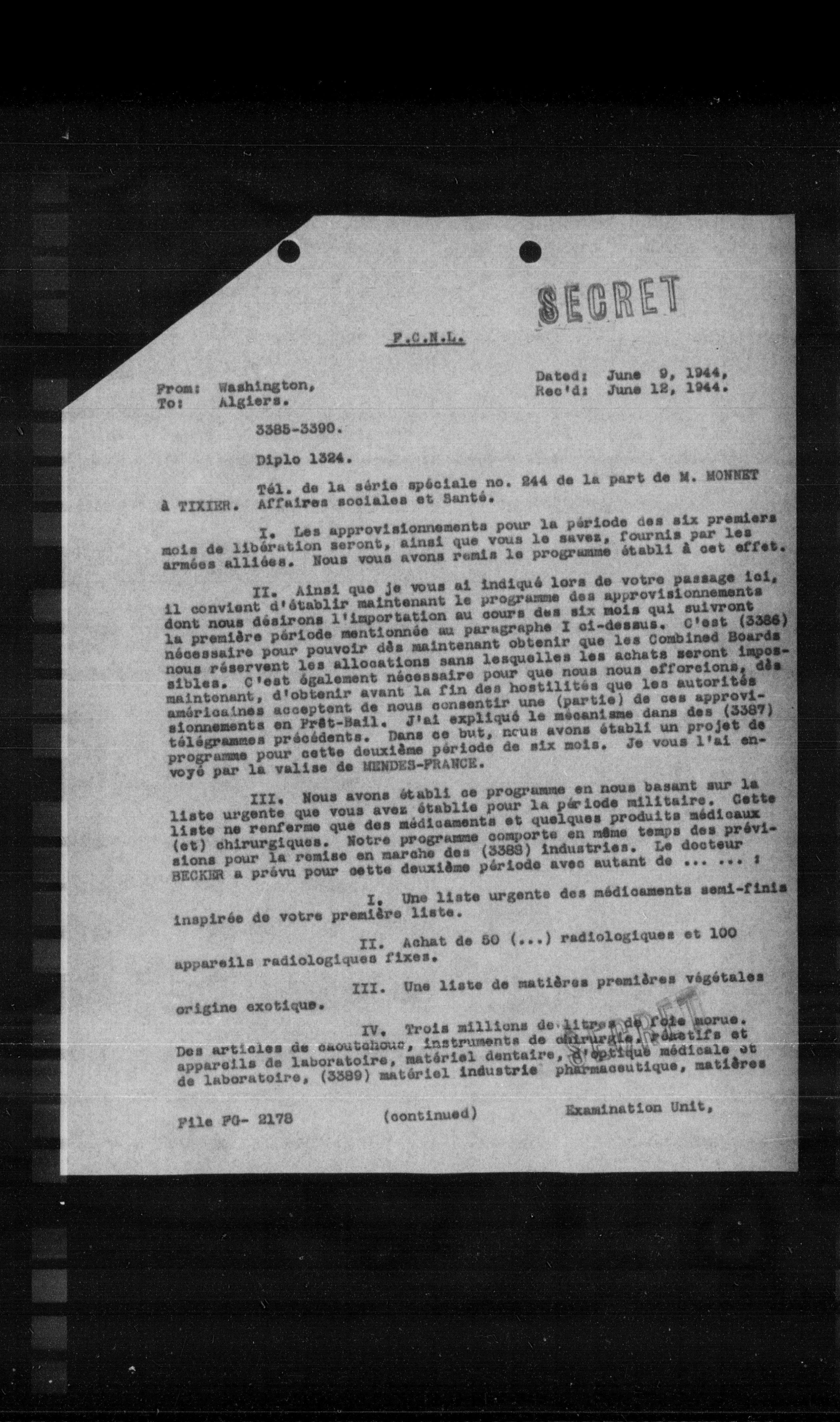 II. Ainsi que je vous ai indiqué lors de votre passage ici, il convient d'établir maintenant le programme des approvisionnements dont nous désirons l'importation au cours des six mois qui suivront la première période mentionnée au paragraphe I ci-dessus. C'est (3386) nécessaire pour pouvoir dès maintenant obtenir que les Combined Boards nous réservent les allocations sans lesquelles les achats seront imposables. C'est également nécessaire pour que nous nous efforcions, dès maintenant, d'obtenir avant la fin des hostilités que les autorités américaines acceptent de nous consentir une (partie) de ces approvisionnements en Prêt-Bail. J'ai expliqué le mécanisme dans des (3387) télégrammes précédents. Dans ce but, nous avons établi un projet de programme pour cette deuxième période de six mois. Je vous l'ai envoyé par la valise de MENDES-FRANCE.