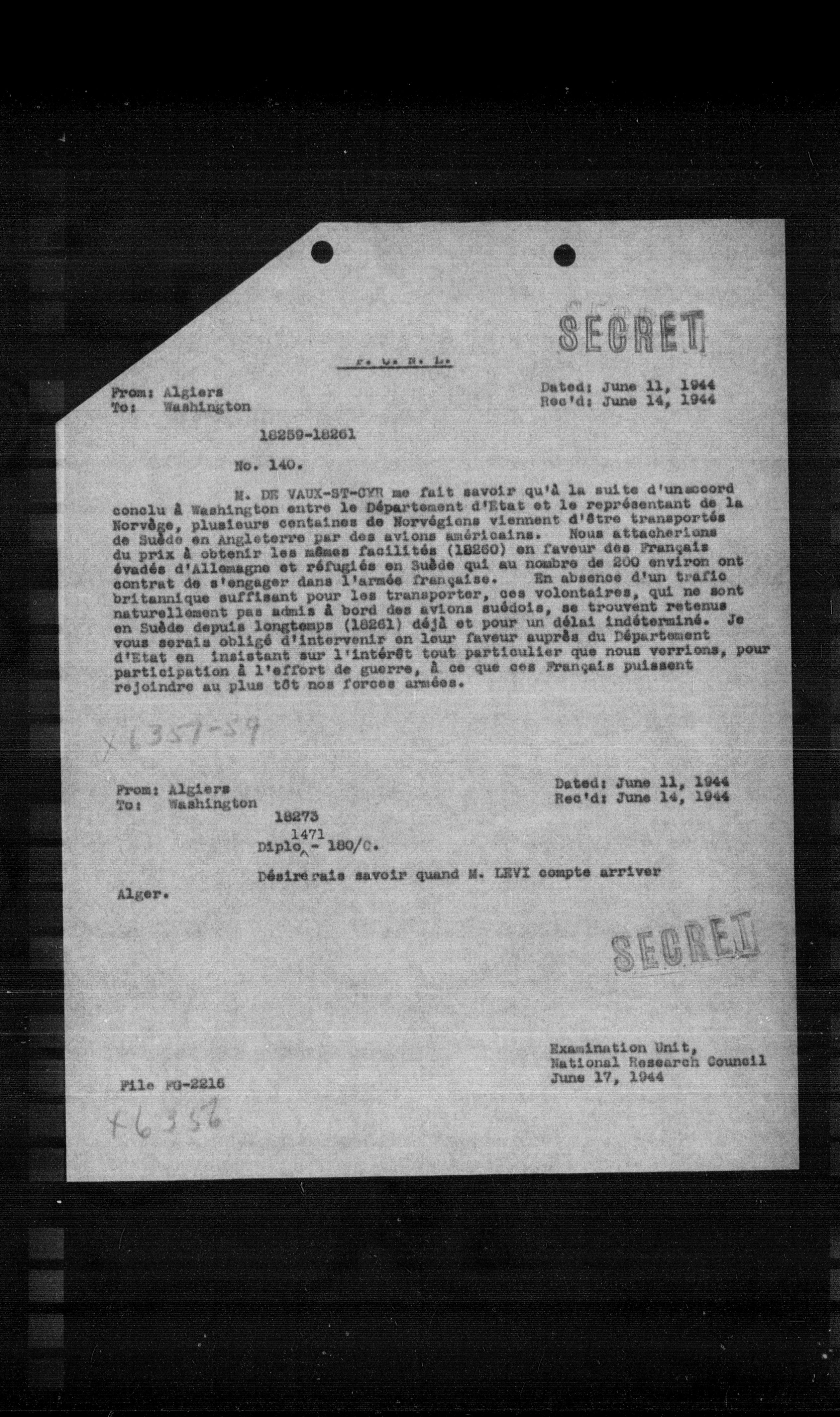 M. DE VAUX-ST-STE me fait savoir qu'à la suite d'un accord conclu à Washington entre le Département d'Etat et le représentant de la Norvège, plusieurs centaines de Norvégiens viennent d'être transportés de Suède en Angleterre par des avions américains. Nous attacherions du prix à obtenir les mêmes facilités (18260) en faveur des Français évadés d'Allemagne et réfugiés en Suède qui au nombre de 200 environ ont contrat de s'engager dans l'armée française. En absence d'un trafic britannique suffisant pour les transporter, ces volontaires, qui ne sont naturellement pas admis à bord des avions suédois, se trouvent retenus en Suède depuis longtemps (18261) déjà et pour un délai indéterminé. Je vous serais obligé d'intervenir en leur faveur auprès du Département d'Etat en insistant sur l'intérêt tout particulier que nous verrions, pour participation à l'effort de guerre, à ce que ces Français puissent rejoindre au plus tôt nos forces armées.