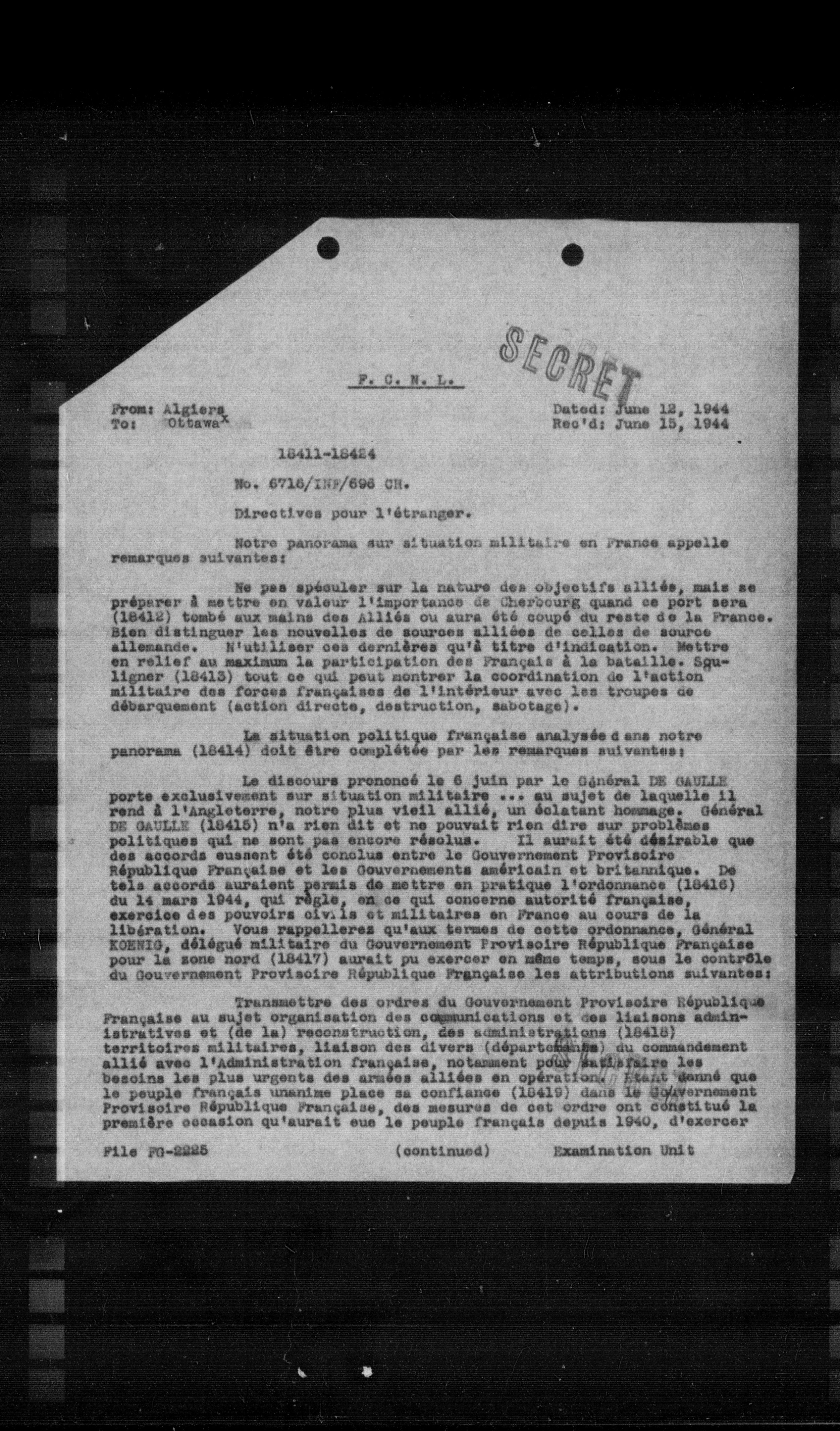 - Territoires militaires, liaison des divers (départements) du commandement allié avec l'Administration française, notamment pour satisfaire les besoins les plus urgents des armées alliées en opération. Etant donné que le peuple français unanime place sa confiance (18419) dans le Gouvernement provisoire République Française, des mesures de cet ordre ont constitué la première occasion qu'aurait eue le peuple français depuis 1940, d'exercer