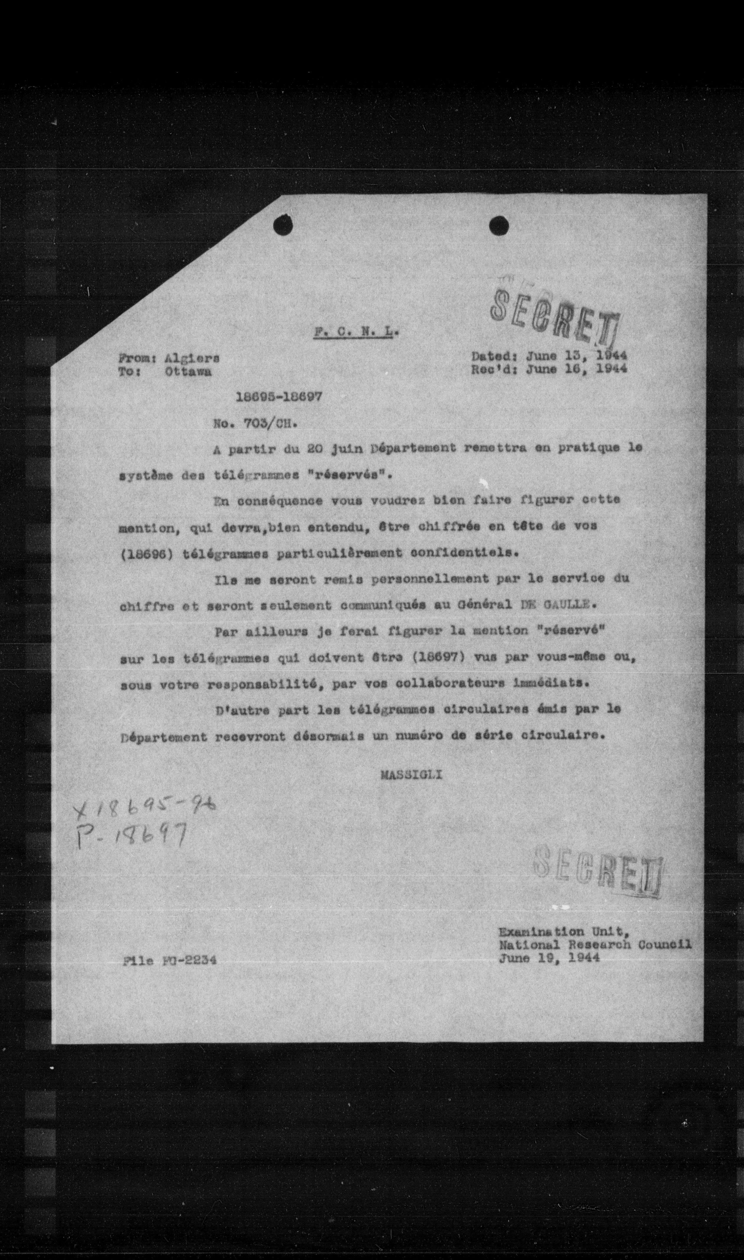 Ils me seront remis personnellement par le service du chiffre et seront seulement communiqués au Général DE GAULLE.