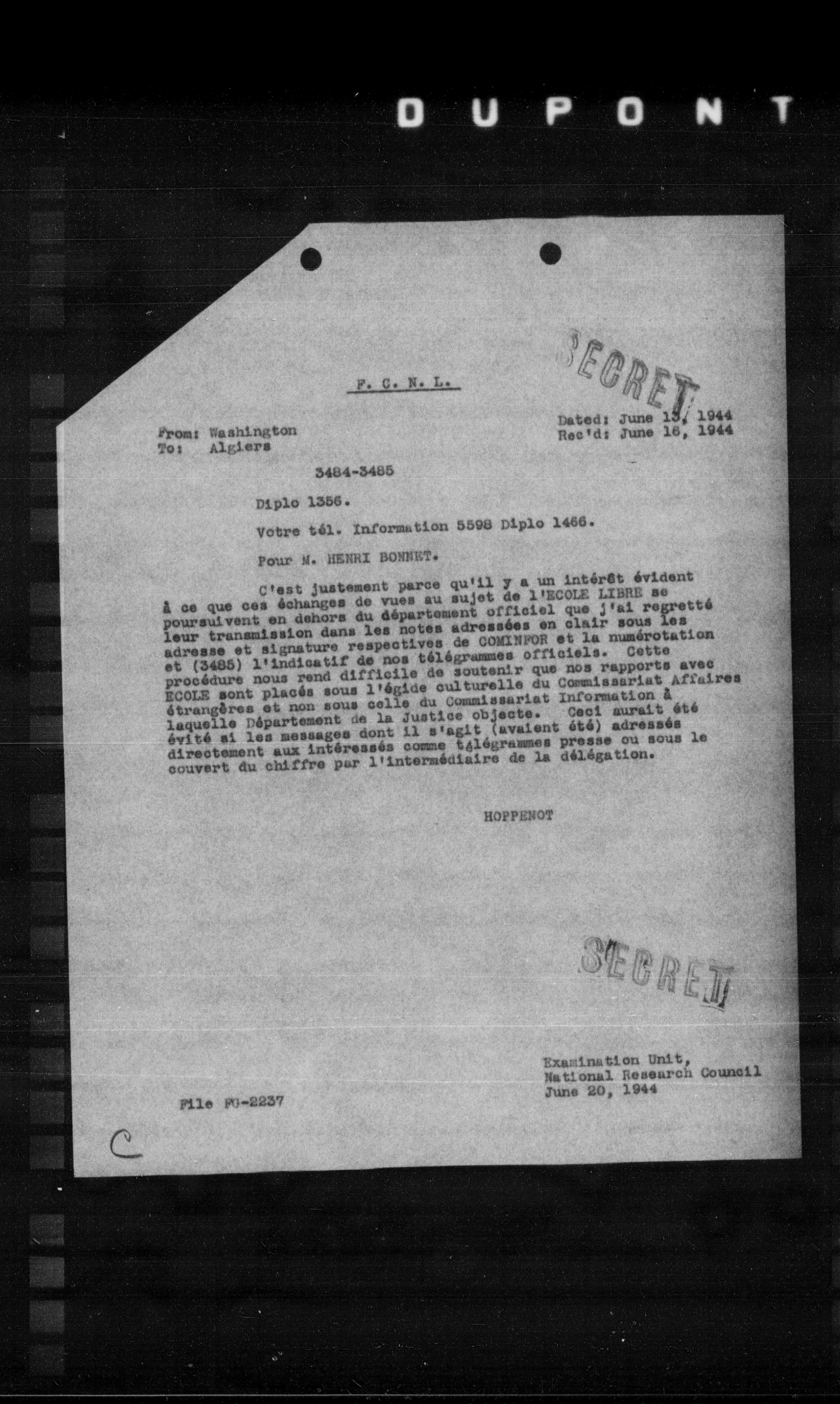 C'est justement parce qu'il y a un intérêt évident \& ce que ces échanges de vues au sujet de l'ECOLE LIBRE se poursuivent en dehors du département officiel que j'ai regretté leur transmission dans les notes adressées en clair sous les adresse et signature respectives de COMINFOR et la numérotation et (3485) l'indicatif de nos télégrammes officiels. Cette procédure nous rend difficile de soutenir que nos rapports avec ECOLE sont placés sous l'égide culturelle du Commissariat Affaires étrangères et non sous celle du Commissariat Information \& laquelle Département de la Justice objecte. Ceci aurait été évité si les messages dont il s'agit (avaient été) adressés directement aux intéressés comme télégrammes presse ou sous le couvert du chiffre par l'intermédiaire de la délégation.