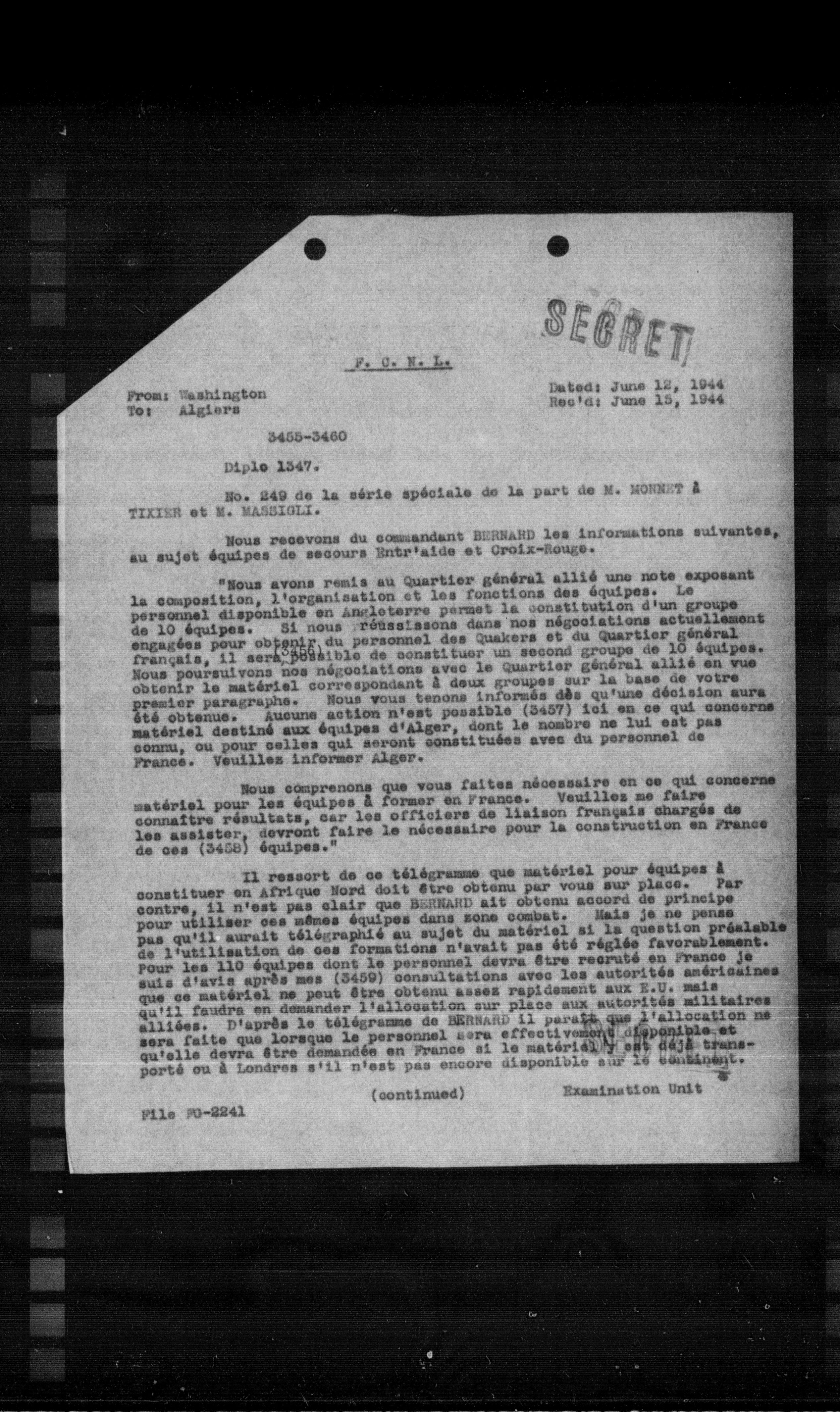 "Nous avons remis au Quartier général allié une note exposant la composition, l'organisation et les fonctions des équipes. Le personnel disponible en Angleterre permet la constitution d'un groupe de 10 équipes. Si nous réussissons dans nos négociations actuellement engagées pour obtenir du personnel des Quakers et du Quartier général français, il sera possible de constituer un second groupe de 10 équipes. Nous poursuivons nos négociations avec le Quartier général allié en vue obtenir le matériel correspondant à deux groupes sur la base de votre premier paragraphe. Nous vous tenons informés dès qu'une décision aura été obtenue. Aucune action n'est possible (3457) ici en ce qui concerne matériel destiné aux équipes d'Alger, dont le nombre ne lui est pas connu, ou pour celles qui seront constituées avec du personnel de France. Veuillez informer Alger.