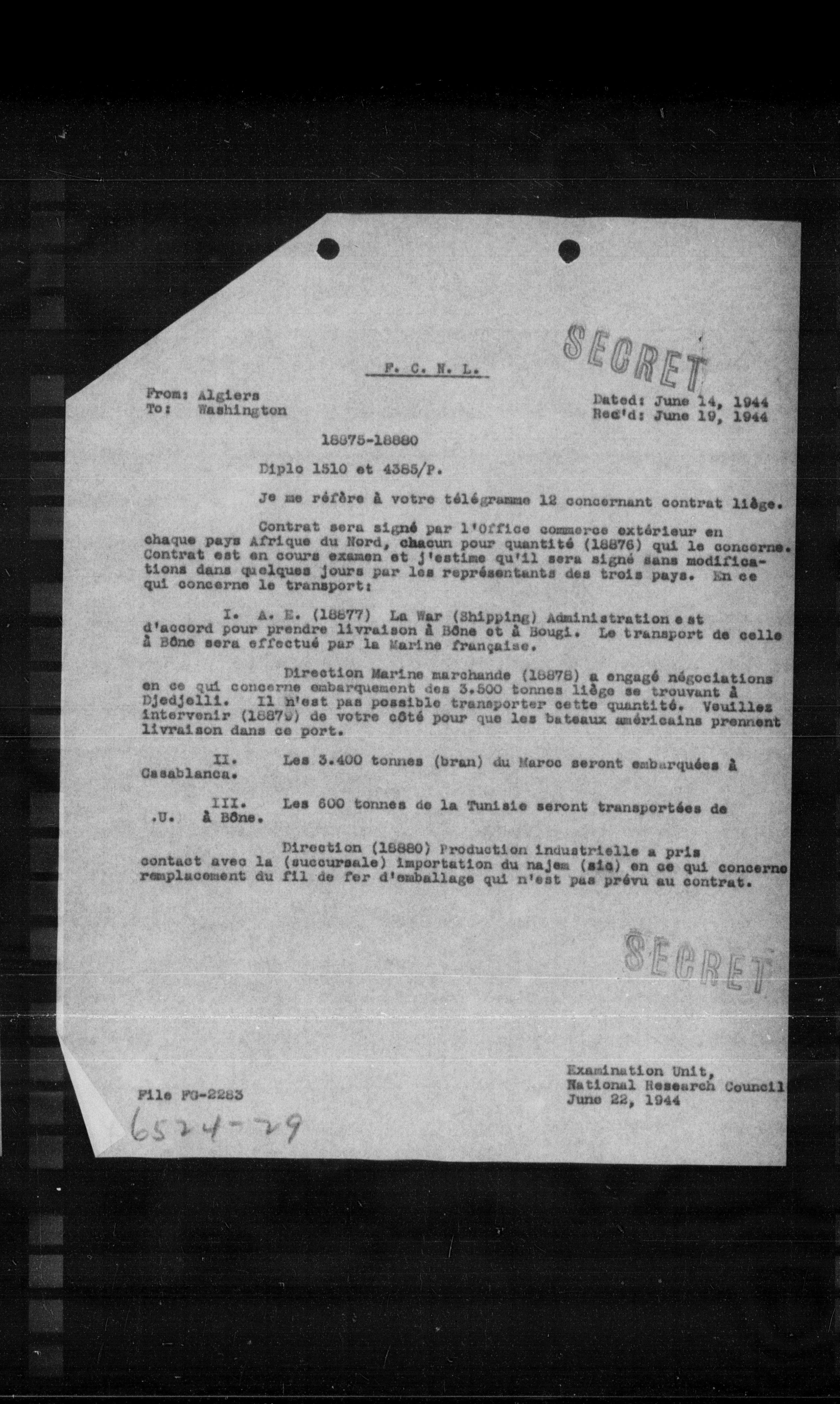 **I. A. E. (18877)** Le War (Shipping) Administration est d'accord pour prendre livraison à Bône et à Bougi. Le transport de celle à Bône sera effectué par la Marine française.