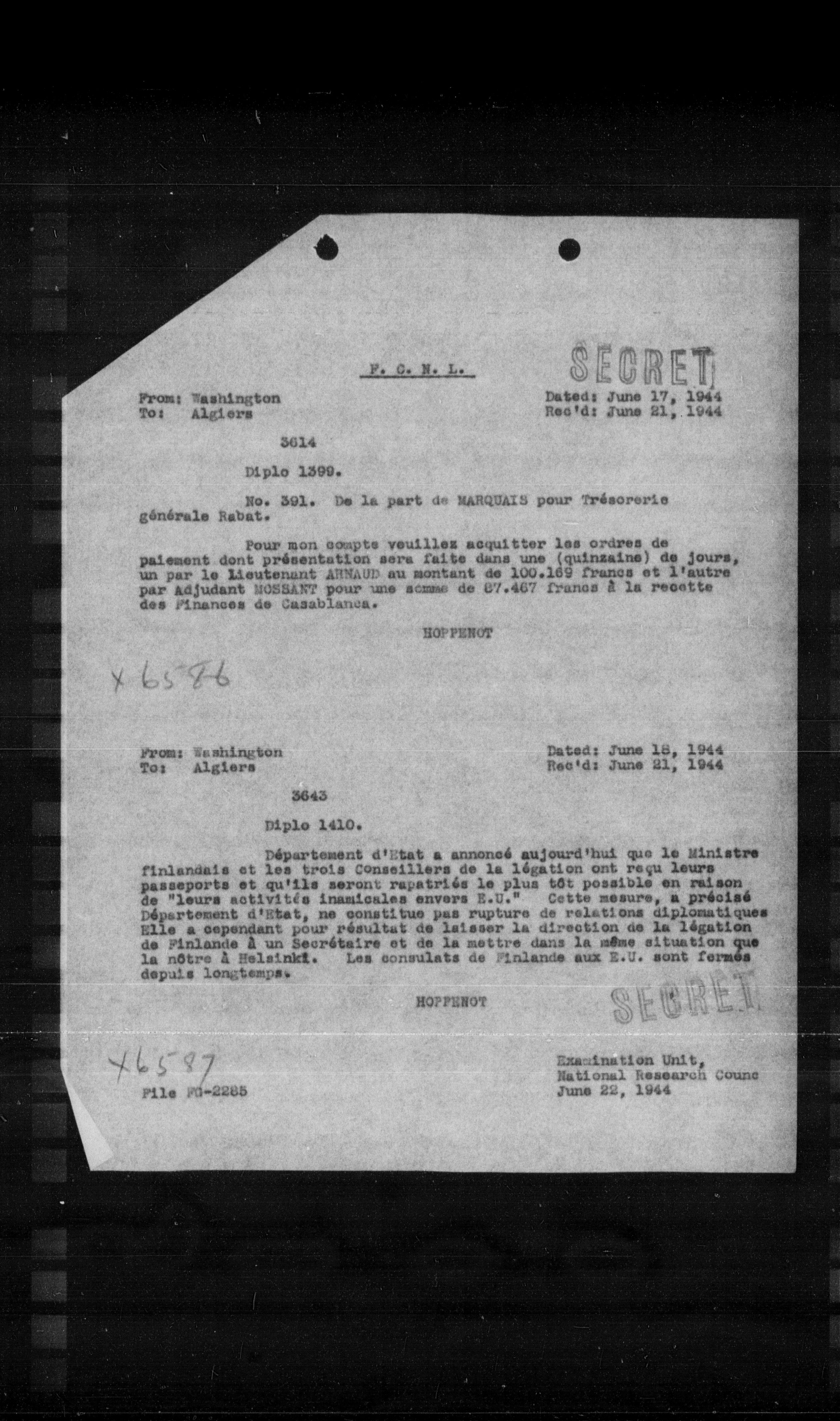Département d'Etat a annoncé aujourd'hui que le Ministre finlandais et les trois Conseillers de la légation ont reçu leurs passeports et qu'ils seront rapatriés le plus tôt possible en raison de "leurs activités inamicales envers E.U." Cette mesure, a précisé Département d'Etat, ne constitue pas rupture de relations diplomatiques. Elle a cependant pour résultat de laisser la direction de la légation de Finlande à un Secrétaire et de la mettre dans la même situation que la nôtre à Helsinki. Les consulats de Finlande aux E.U. sont fermés depuis longtemps.