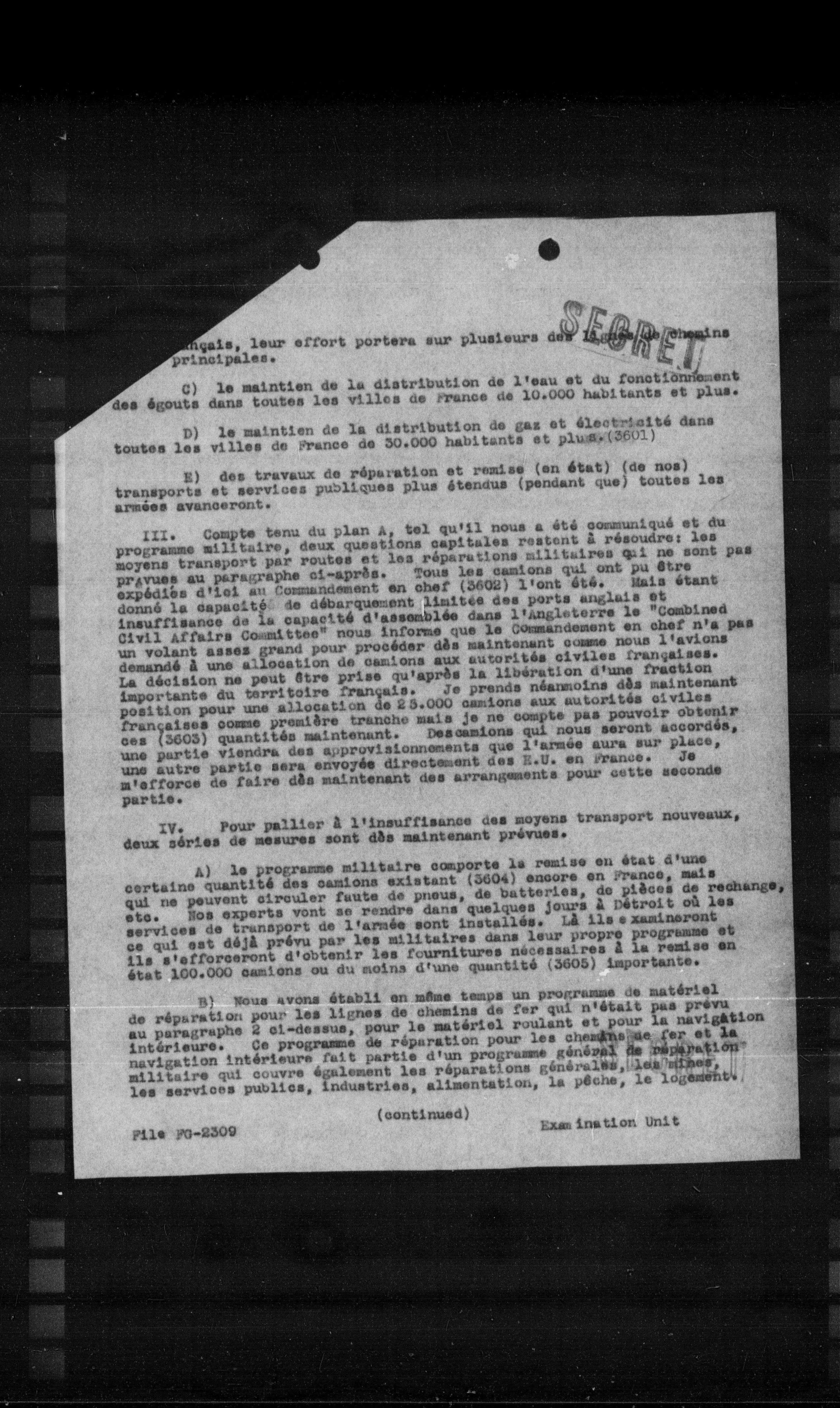 III. Compte tenu du plan A, tel qu'il nous a été communiqué et du programme militaire, deux questions capitales restent à résoudre: les moyens transport par routes et les réparations militaires qui ne sont pas prévues au paragraphe ci-après. Tous les camions qui ont pu être expédiés d'ici en commandement en chef (3602) l'ont été. Mais étant donné la capacité de débarquement limitée des ports anglais et insuffisance de la capacité d'assemblée dans l'Angleterre le "Combined Civil Affairs Committee" nous informe que le commandement en chef n'a pas un volant assez grand pour procéder dès maintenant comme nous l'avions demandé à une allocation de camions aux autorités civiles françaises. La décision ne peut être prise qu'après la libération d'une fraction importante du territoire français. Je prends néanmoins dès maintenant position pour une allocation de 25.000 camions aux autorités civiles françaises comme première tranche mais je ne compte pas pouvoir obtenir ces (3603) quantités maintenant. Des camions qui nous seront accordés, une partie viendra des approvisionnements que l'armée aura sur place, une autre partie sera envoyée directement des E.U. en France. Je m'efforce de faire dès maintenant des arrangements pour cette seconde partie.