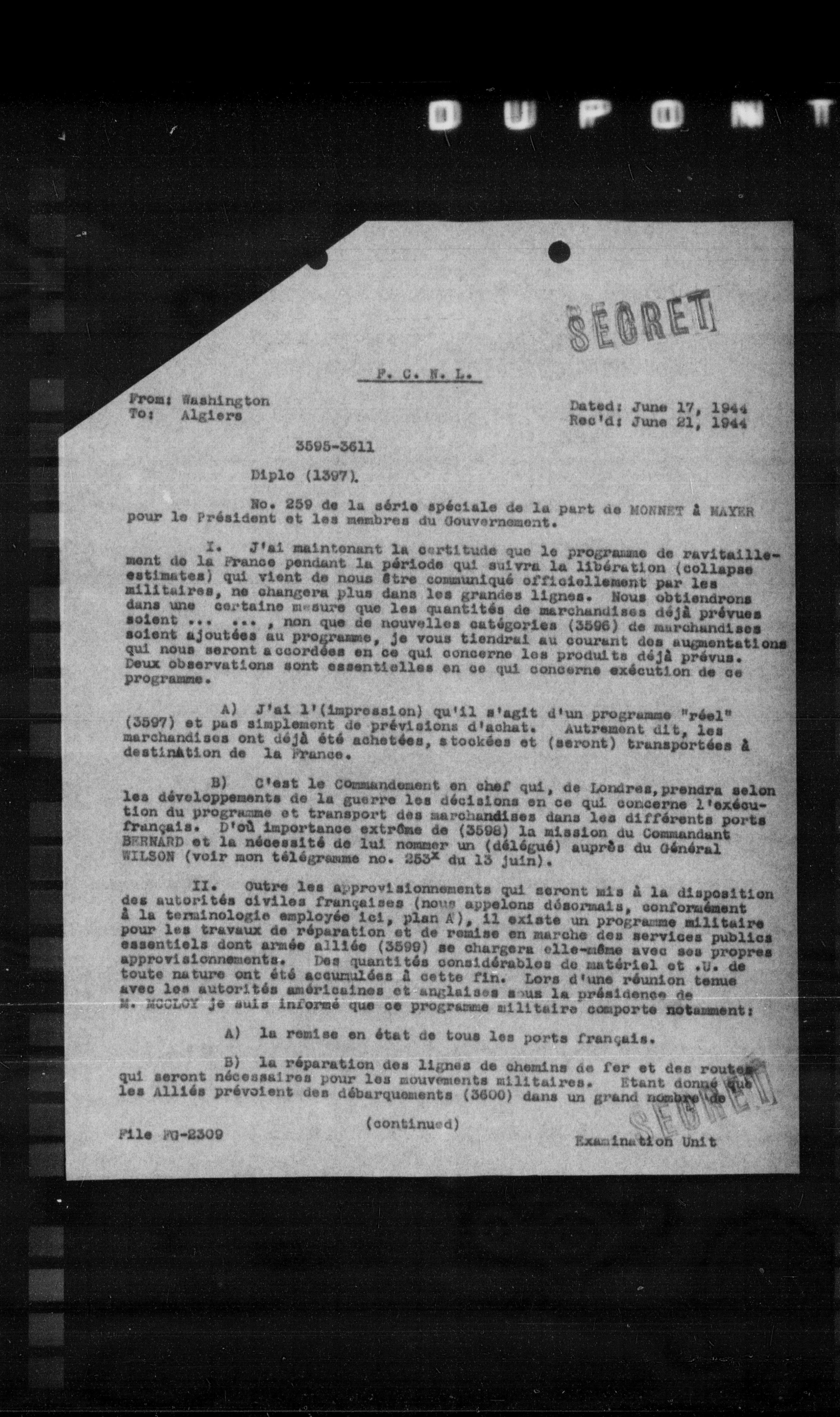 I. J'ai maintenant la certitude que le programme de ravitaillement de la France pendant la période qui suivra la libération (collapse estimates) qui vient de nous être communiqué officiellement par les militaires, ne changera plus dans les grandes lignes. Nous obtiendrons dans une certaine mesure que les quantités de marchandises déjà prévues soient ... ... , non que de nouvelles catégories (3596) de marchandises soient ajoutées au programme, je vous tiendrai au courant des augmentations qui nous seront accordées en ce qui concerne les produits déjà prévus. Deux observations sont essentielles en ce qui concerne l'exécution de ce programme.