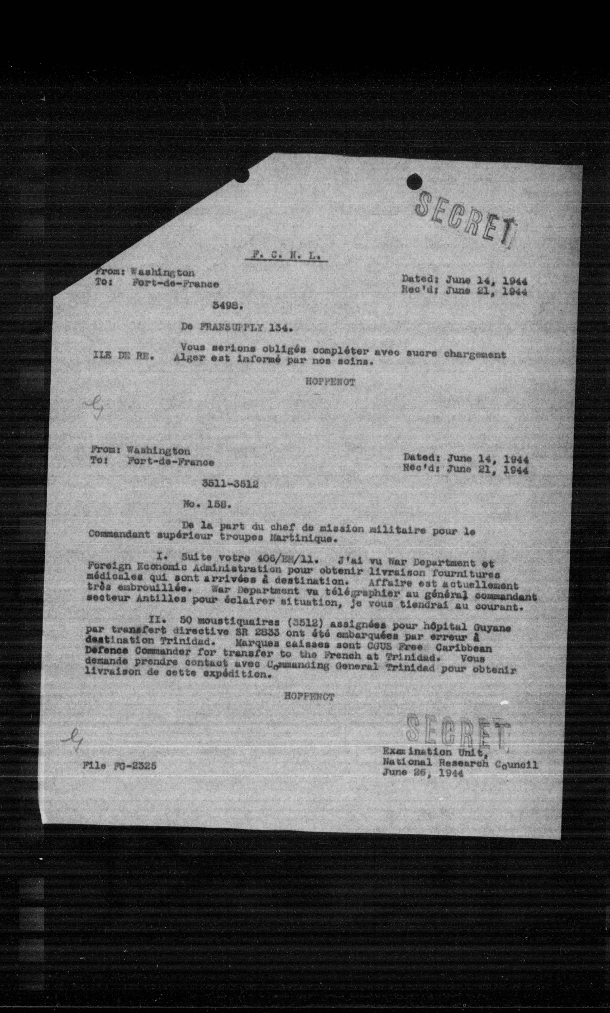 II. 50 moustiquaires (3812) assignées pour hôpital Guyane par transfert directive SR 2835 ont été embarquées par erreur à destination Trinidad. Marques caisses sont CGUS Free Caribbean Defence Commander for transfer to the French at Trinidad. Vous demande prendre contact avec Cammending General Trinidad pour obtenir livraison de cette expédition.
