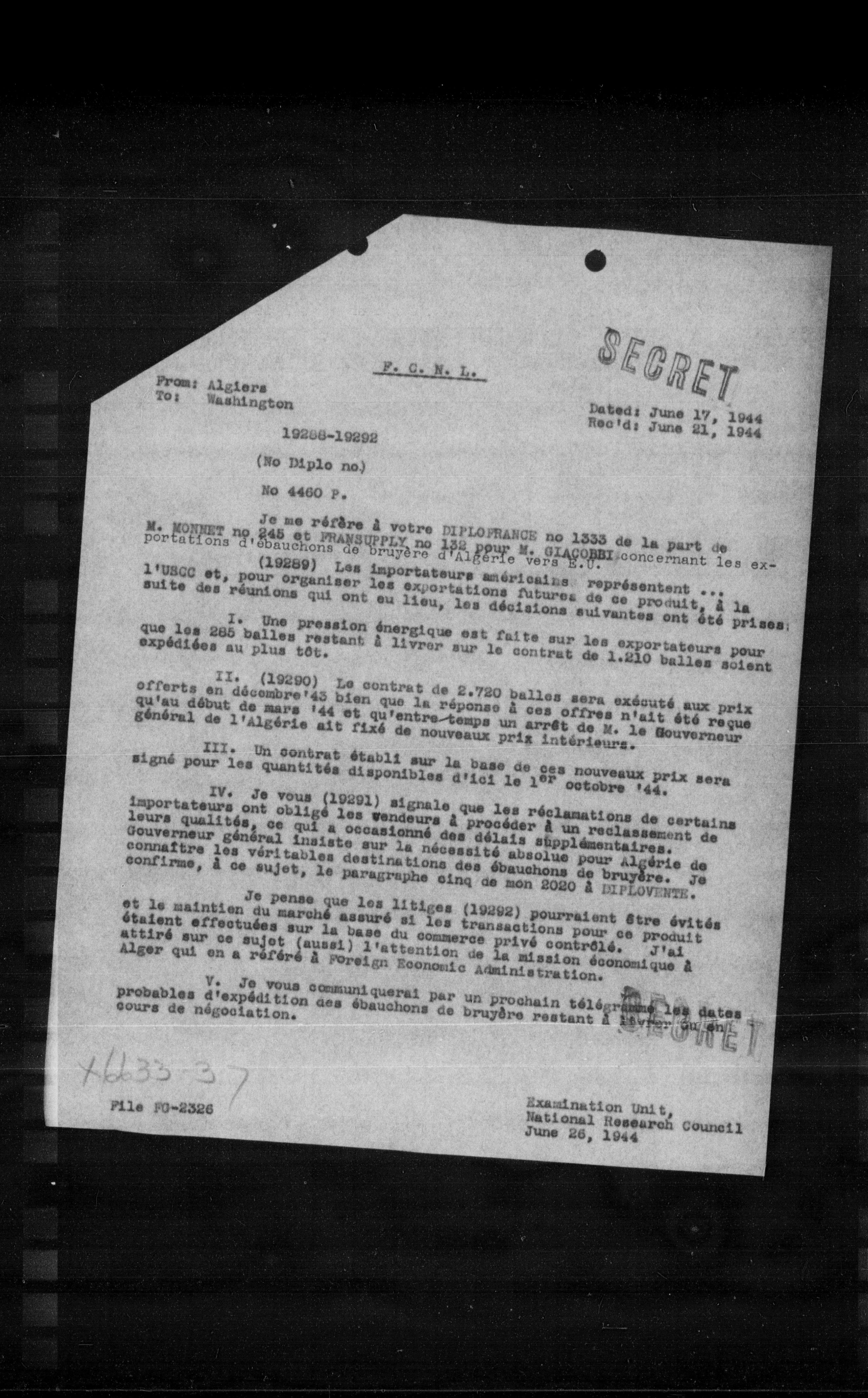Je pense que les litiges (19292) pourraient être évités et le maintien du marché assuré si les transactions pour ce produit étaient effectuées sur la base du commerce privé contrôlé. J'ai attiré sur ce sujet (aussi) l'attention de la mission économique à Alger qui en a référé à Foreign Economic Administration.