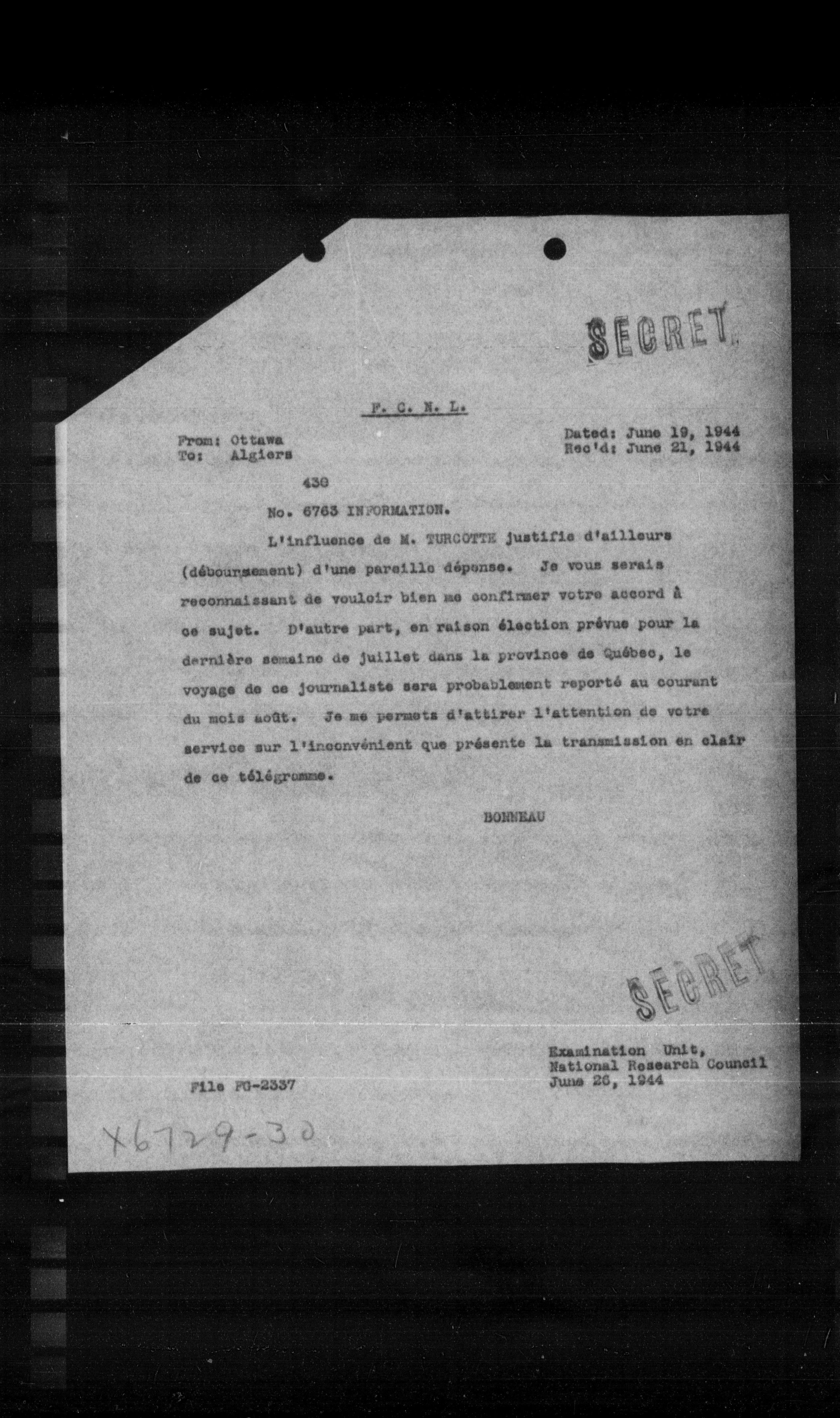 L'influence de M. TURCOTTE justifie d'ailleurs (déboursement) d'une pareille dépense. Je vous serais reconnaissant de vouloir bien me confirmer votre accord à ce sujet. D'autre part, en raison élection prévue pour la dernière semaine de juillet dans la province de Québec, le voyage de ce journaliste sera probablement reporté au courant du mois août. Je me permets d'attirer l'attention de votre service sur l'inconvénient que présente la transmission en clair de ce telégrome.