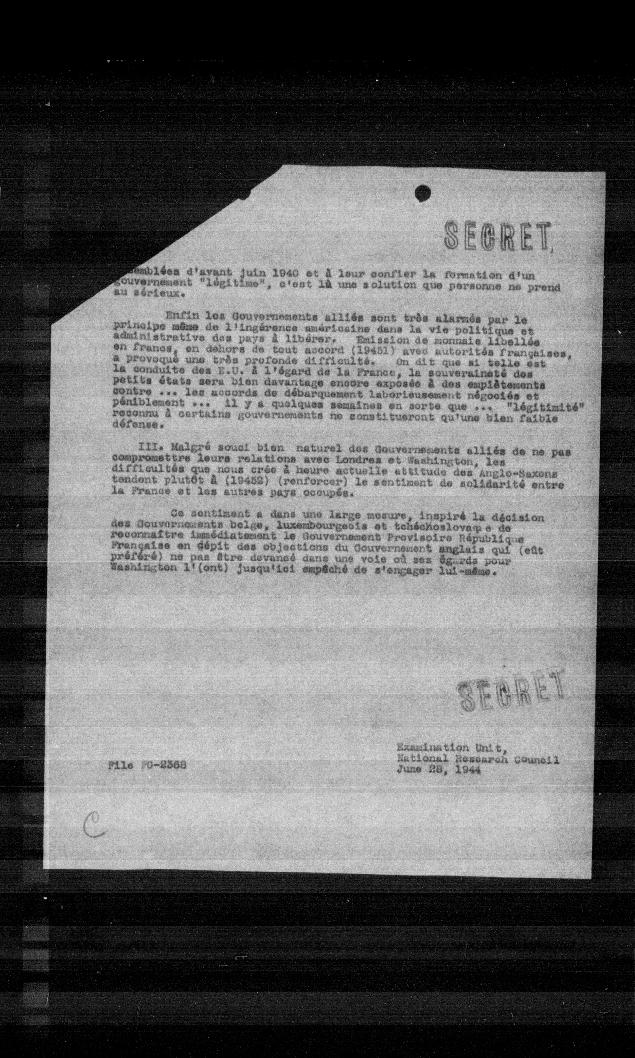 Enfin les Gouvernements alliés sont très alarmés par le principe même de l'ingérence américaine dans la vie politique et administrative des pays a libérer. Emission de monnaie libellée en francs, en dehors de tout accord (19451) avec autorités frangaises, a provoqué une très profonde difficulté. On dit que si telle est la conduite des E.U. a l'égard de la France, la souveraineté des petits états sera bien davantage encore exposée a des emplètements contre ... les accords de débarquement laborieusement négociés et péniblement ... il y a quelques semaines en sorte que ... "légitimité" reconnu a certains gouvernements ne constitueront qu'une bien faible défense.