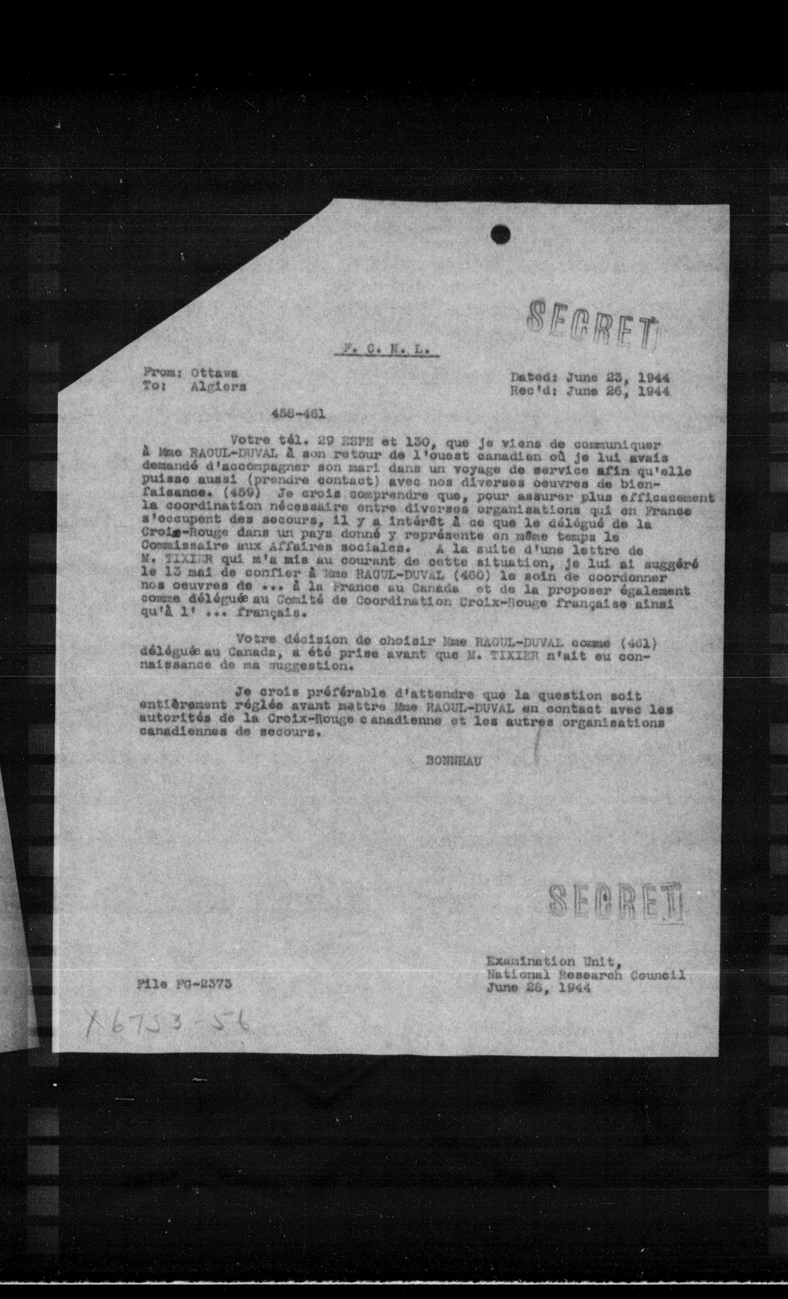 Votre tél. 29 EDPE et 150, que je viens de communiquer à Mme RAOUL-DUVAL à son retour de l'ouest canadien où je lui avais demandé d'accompagner son mari dans un voyage de service afin qu'elle puisse aussi (prendre contact) avec nos diverses œuvres de bien-faisance. (459) Je crois comprendre que, pour assurer plus efficacement la coordination nécessaire entre diverses organisations qui en France s'occupent des secours, il y a intérêt à ce que le délégué de la Croix-Rouge dans un pays donné y représente en même temps le Commissaire aux Affaires sociales. À la suite d'une lettre de M. TIXIER qui m'a mis au courant de cette situation, je lui ai suggéré le 15 mai de confier à Mme RAOUL-DUVAL (460) le soin de coordonner nos œuvres de ... à la France au Canada et de la proposer également comme délégué au Comité de Coordination Croix-Rouge française ainsi qu'à l' ... Français.