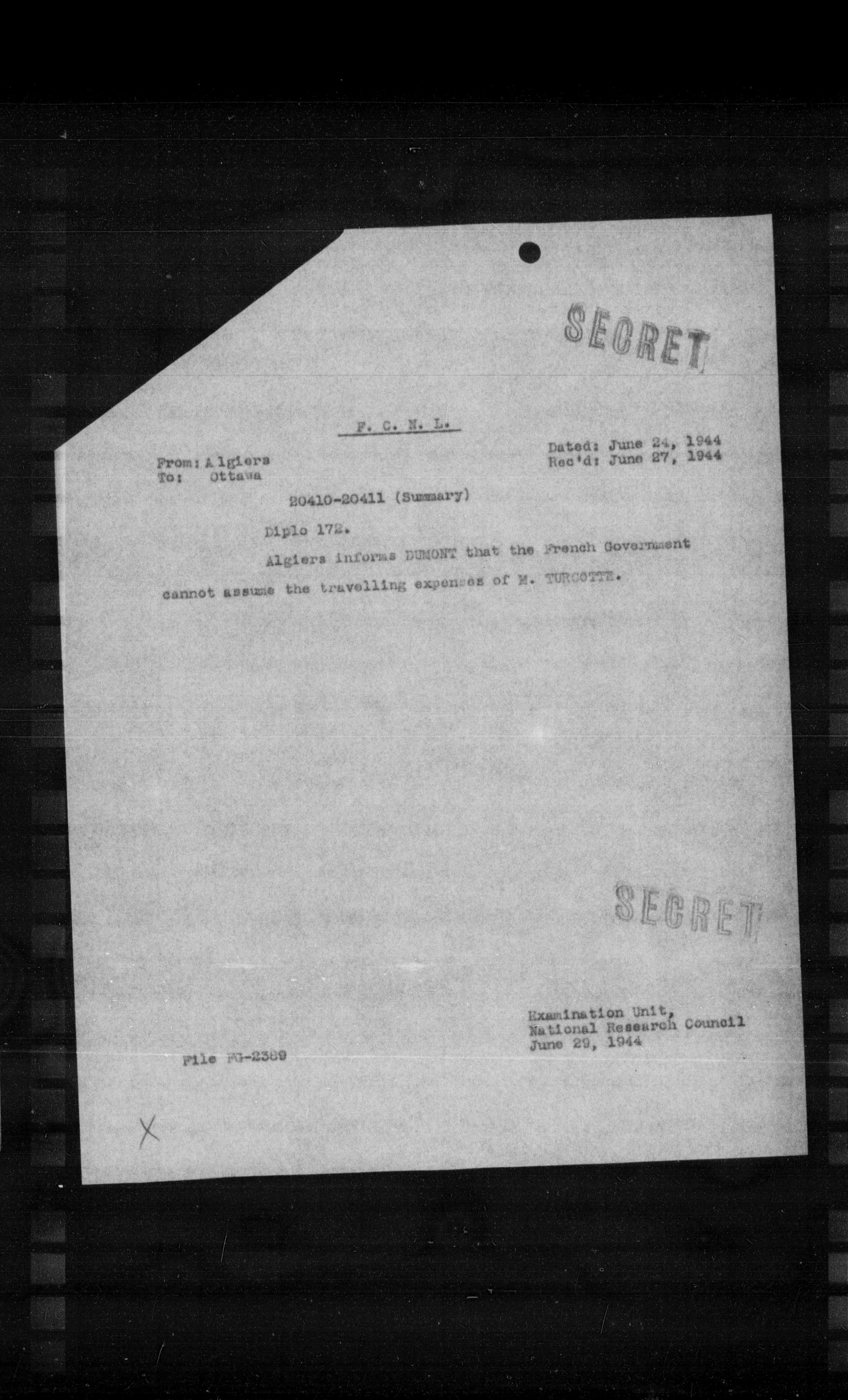 Algiers informs DUMONT that the French Government cannot assume the travelling expenses of M. TURCOYTE.