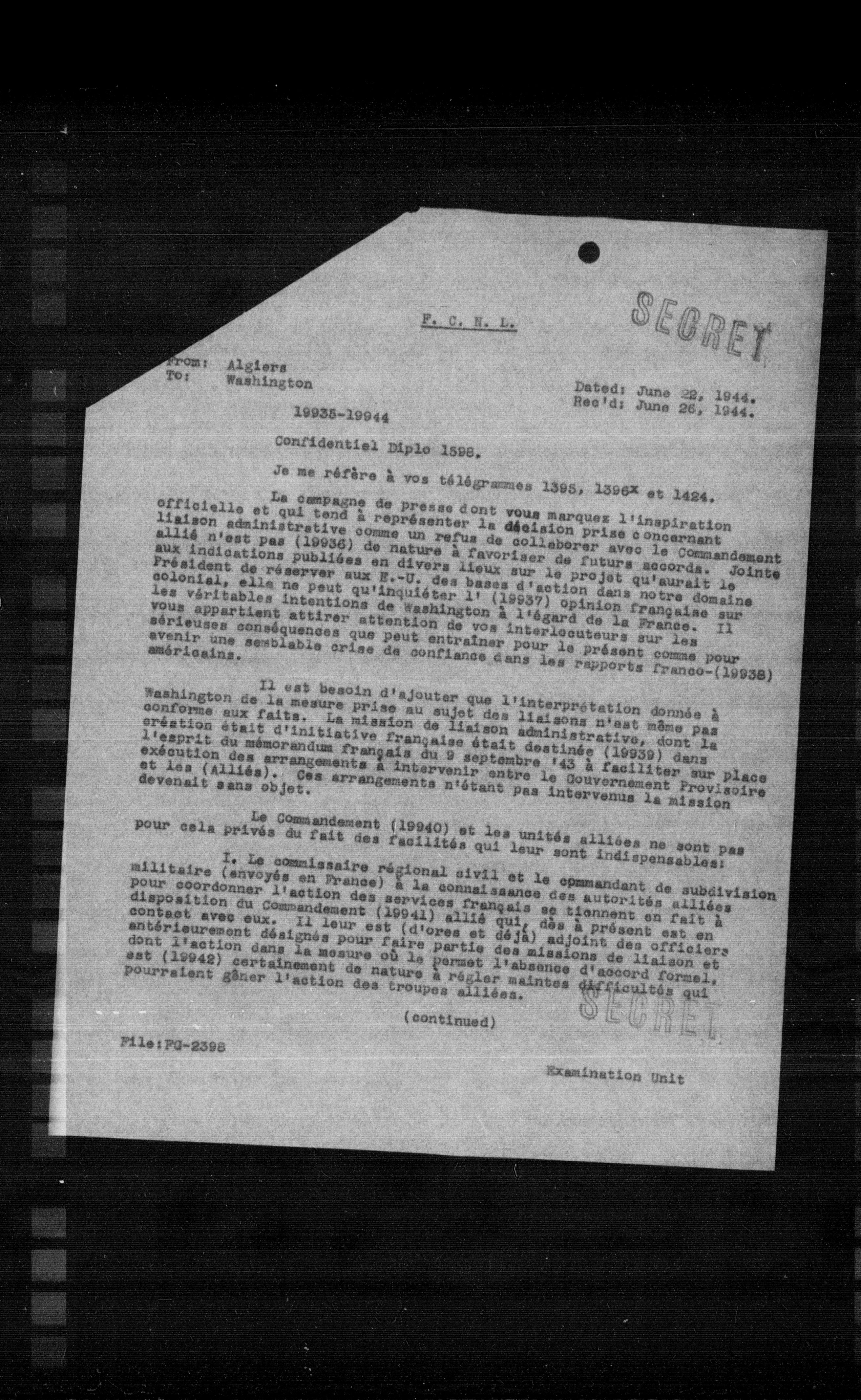 Il est besoin d'ajouter que l'interprétation donnée à Washington de la mesure prise au sujet des liaisons n'est même pas conforme aux faits. La mission de liaison administrative, dont la création était d'initiative française était destinée (19939) dans l'esprit du mémorandum français du 9 septembre '43 à faciliter sur place l'exécution des arrangements à intervenir entre le Gouvernement Provisoire et les (Alliés). Ces arrangements n'étant pas intervenus la mission devenait sans objet.