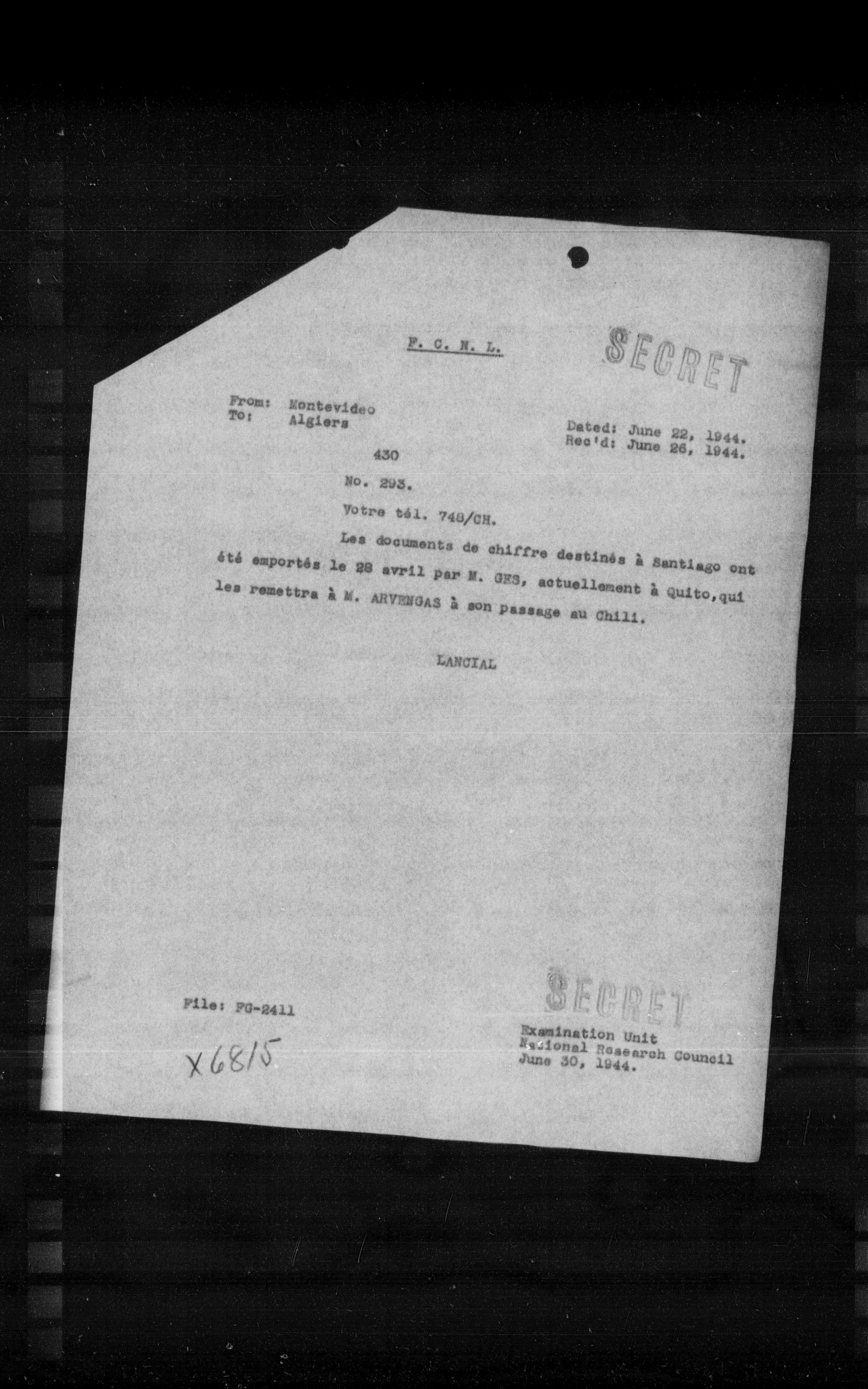 Les documents de chiffre destinés à Santiago ont été emportés le 28 avril par N. GES, actuellement à Quito, qui les remettra à N. ANYENGAS à son passage au Chili.
