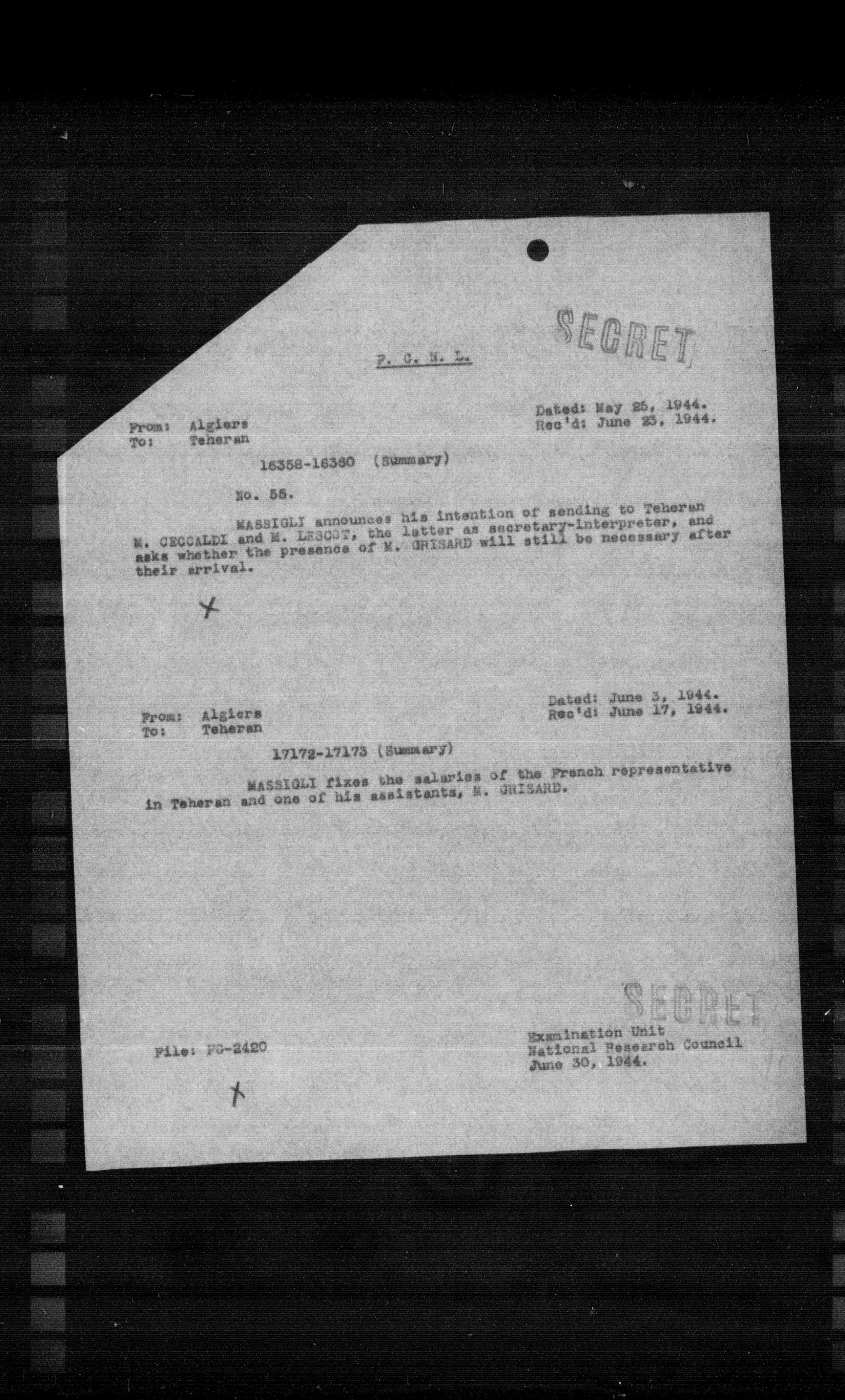 **From:** Algiers **To:** Teheran **Date:** June 3, 1944. **Rec'd:** June 17, 1944.