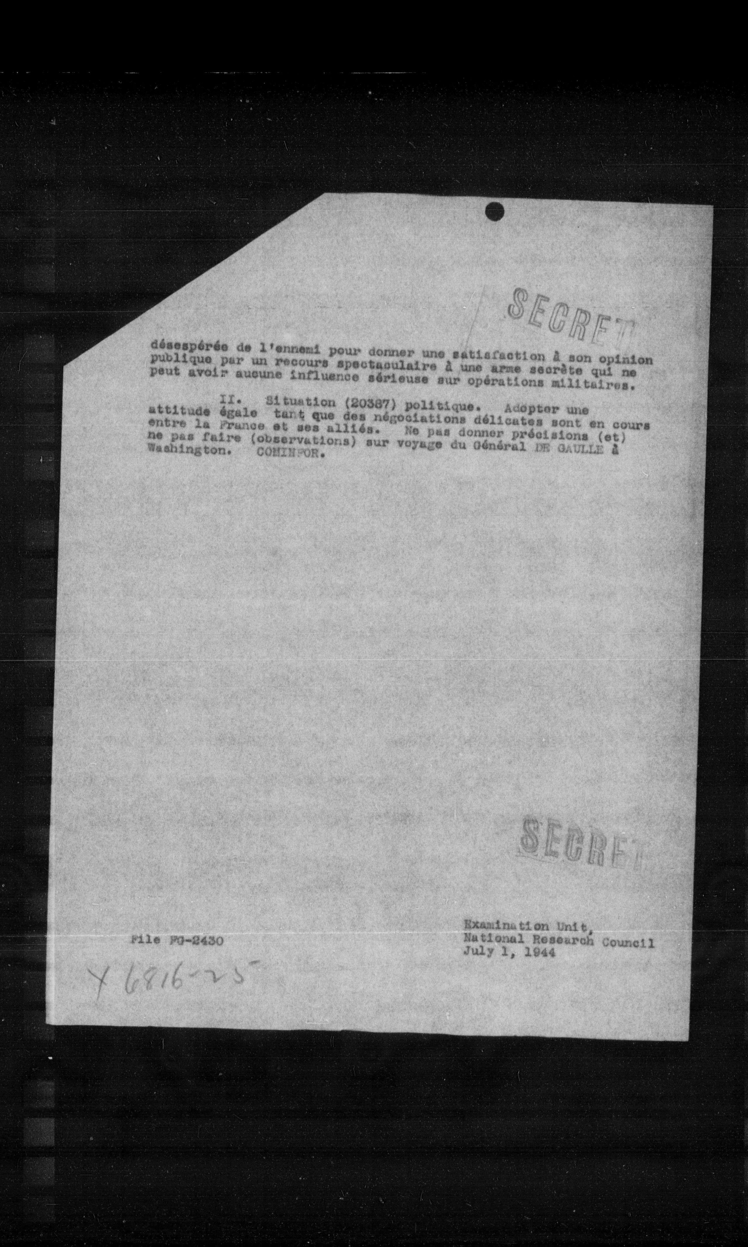 II. Situation (20387) politique. Adopter une attitude égale tant que des négociations délicates sont en cours entre la France et ses alliés. Ne pas donner précisions (et) ne pas faire (observations) sur voyage du général DE GAULLE à Washington. CONINFON.