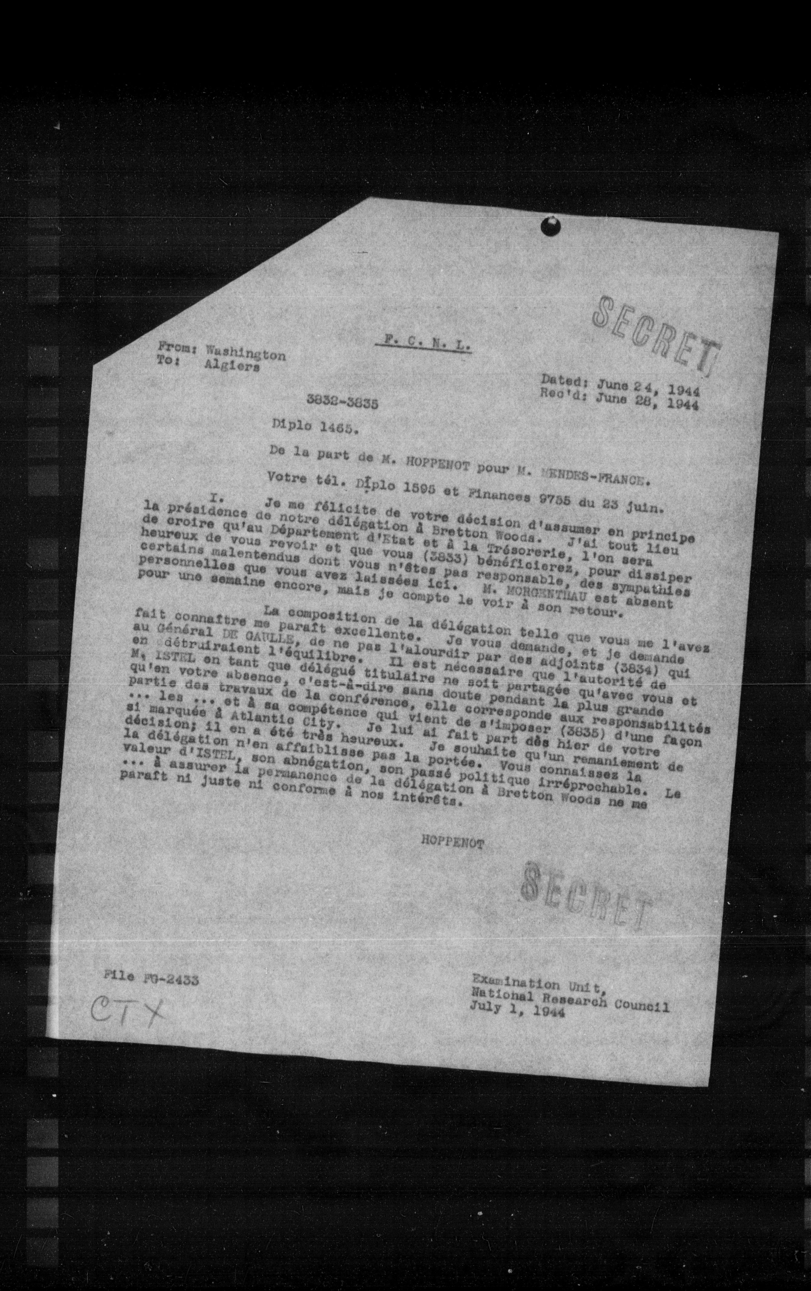 I. Je me félicite de votre décision d'assumer en principe la présidence de notre délégation à Bretton Woods. J'ai tout lieu heureux de vous revoir et que vous (2833) bénéficieré, l'on sera certain malentendus dont vous n'êtes pas responsable, des sympathies personnelles que vous avez laissées ici. M. MORGENTHAU est absent pour une semaine encore, mais je compte le voir à son retour.