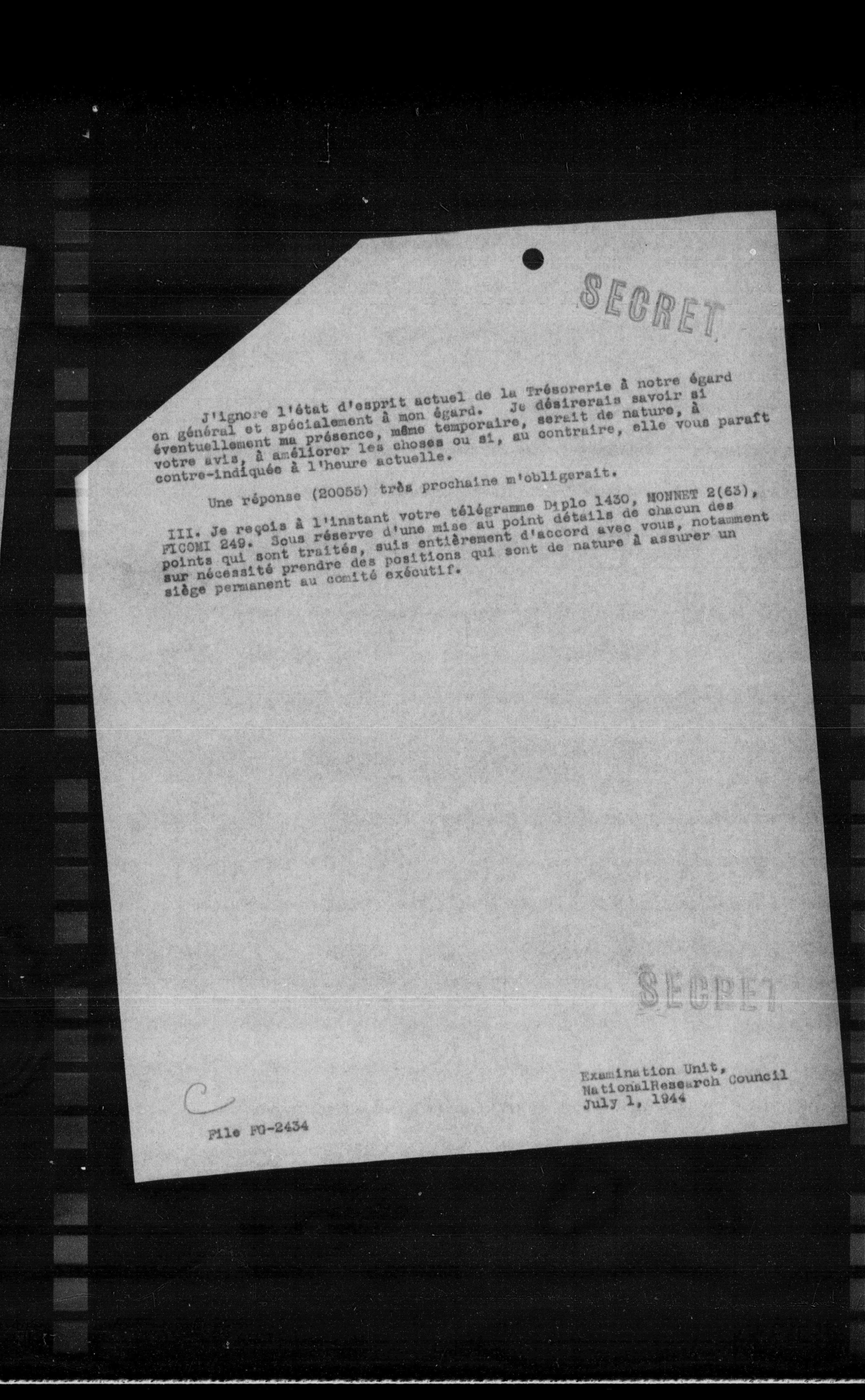 III. Je reçois à l'instant votre télégramme D1plo 1430, MONNET 2(63), FICOBI 249. Sous réserve d'une mise au point détails de chacun des points qui sont traités, suis entièrement d'accord avec vous, notamment sur nécessité prendre des positions qui sont de nature à assurer un siége permanent au comité exécutif.