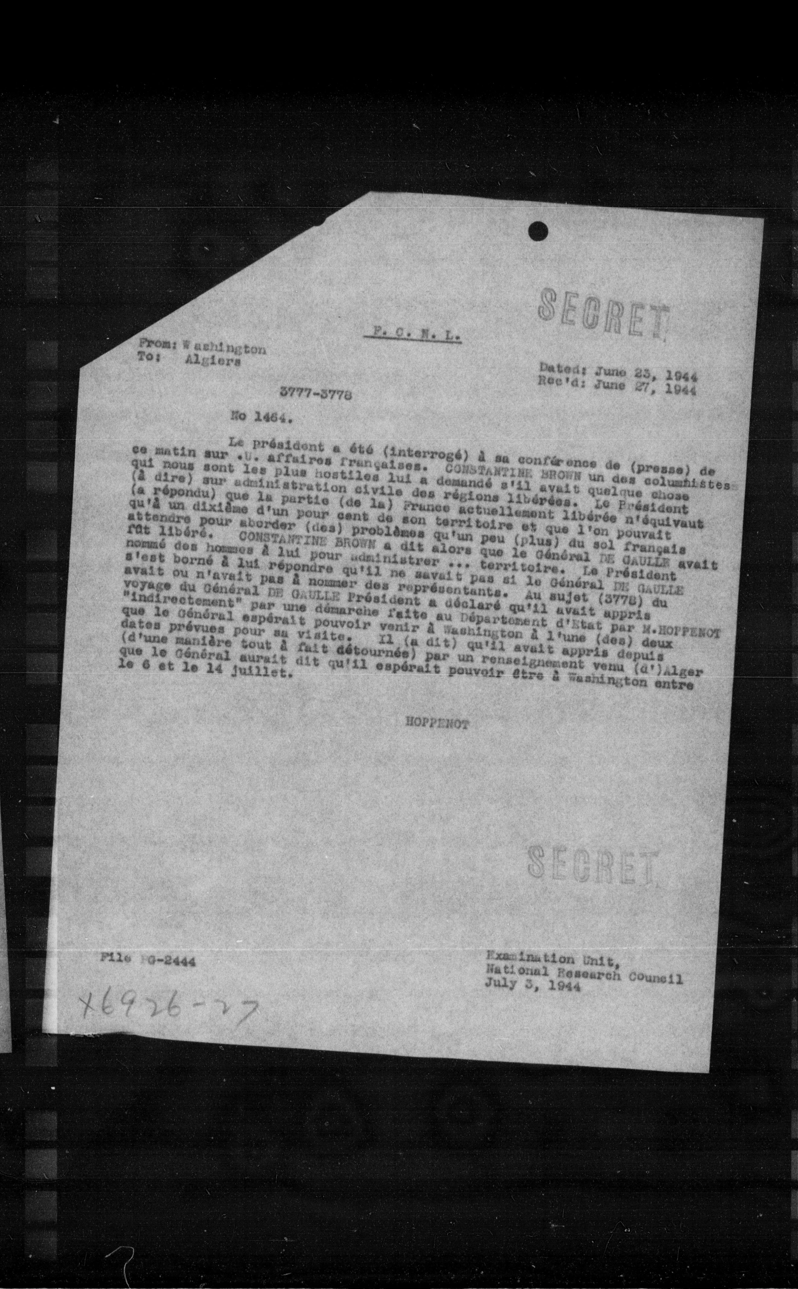 Le président a été (interrogé) à sa conférence de (presse) de ce matin sur « affaires françaises. CONSTANTINE BROWN un des columbistes qui nous sont les plus hostiles lui a demandé s'il avait quelque chose (à dire) sur administration civile des régions libérées. Le président (a répondu) que le partie (de la) France actuellement libérée n'équivaut qu'à un dixième d'un pour cent de son territoire et que l'on pouvait attendre pour aborder (des) problèmes qu'un peu (plus) du sol français fût libéré. CONSTANTINE BROWN a dit alors que le Général DE GAULLE avait nommé des hommes à lui pour administrer ... territoire. Le président s'est borné à lui répondre qu'il ne savait pas si le Général DE GAULLE avait ou n'avait pas à nommer des représentants. Au sujet (3778) du voyage du Général DE GAULLE Président a déclaré qu'il avait appris "indirectement" par une démarche faite au Département d'Etat par M. HOPPENOT que le Général espérait pouvoir venir à Washington à l'une (des) deux dates prévues pour sa visite. Il (a dit) qu'il avait appris depuis (d'une manière tout à fait détournée) par un renseignement venu (d') Alger que le Général aurait dit qu'il espérait pouvoir être à Washington entre le 6 et le 14 juillet.