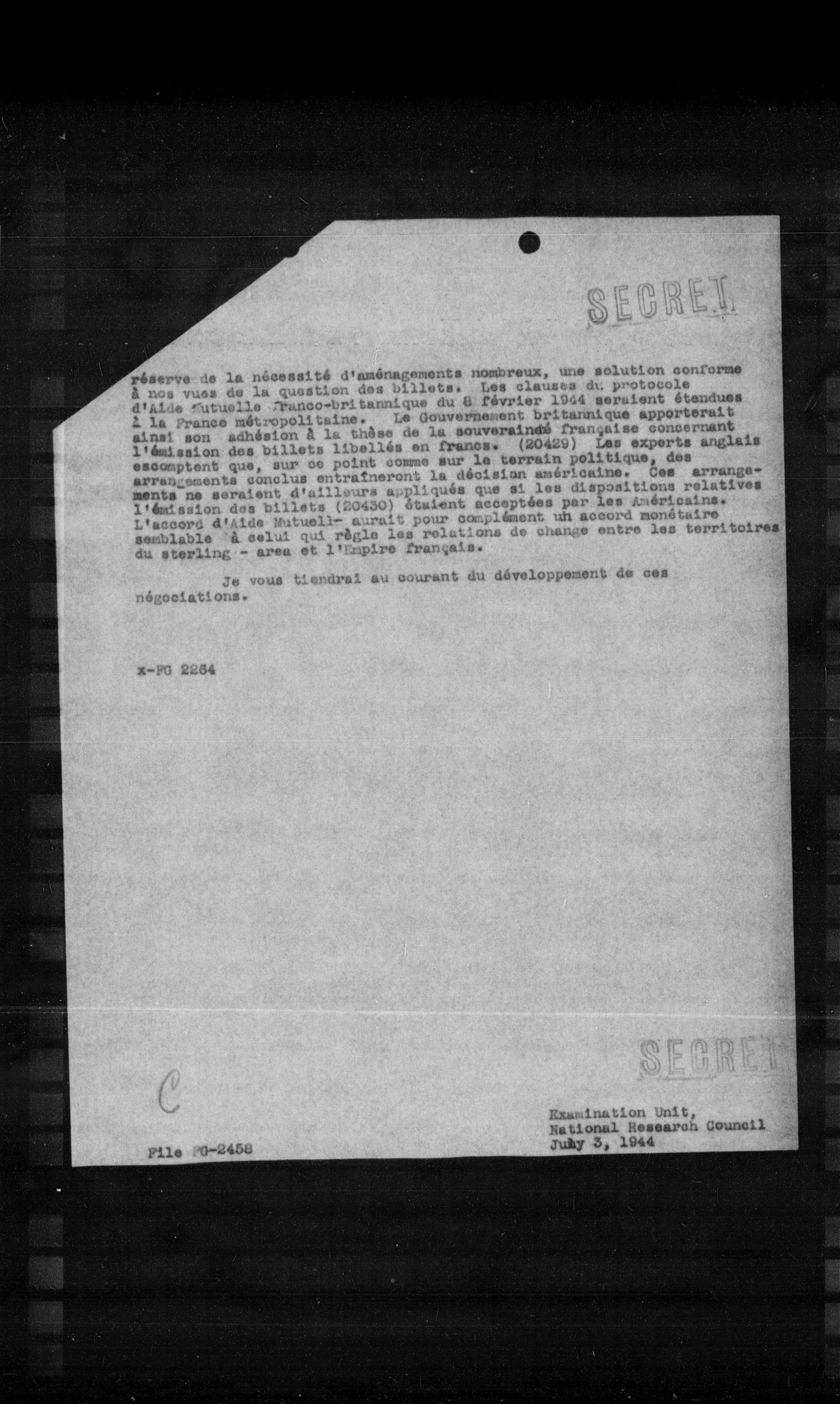 reserve de la nécessité d'aménagements nombreux, une solution conforme a nos vues de la question des billets. Les clauses du protocole d'aide Mutuelle franco-britannique du 8 février 1944 seraient étendues a la rrance métropolitaine. Le Gouvernement britanrique apporterait ainsi son adhésion a la thèse de la souverainedé française concernant l'emission des billets libellés en francs. (20429) Les experts anglais escomptent que, sur ce point comme sur le terrain politique, des arrangements conclus entraineront la décision américaine. Ces arrangements ne seraient d'ailleurs appliqués que si les dispositions relatives l'emission des billets (20430) étaient acceptées par les Américains. L'accord d'aide Mutuelle aurait pour complément un accord monétaire semblable a celui qui régle les relations de change entre les territoires du sterling - area et l'Empire français.
