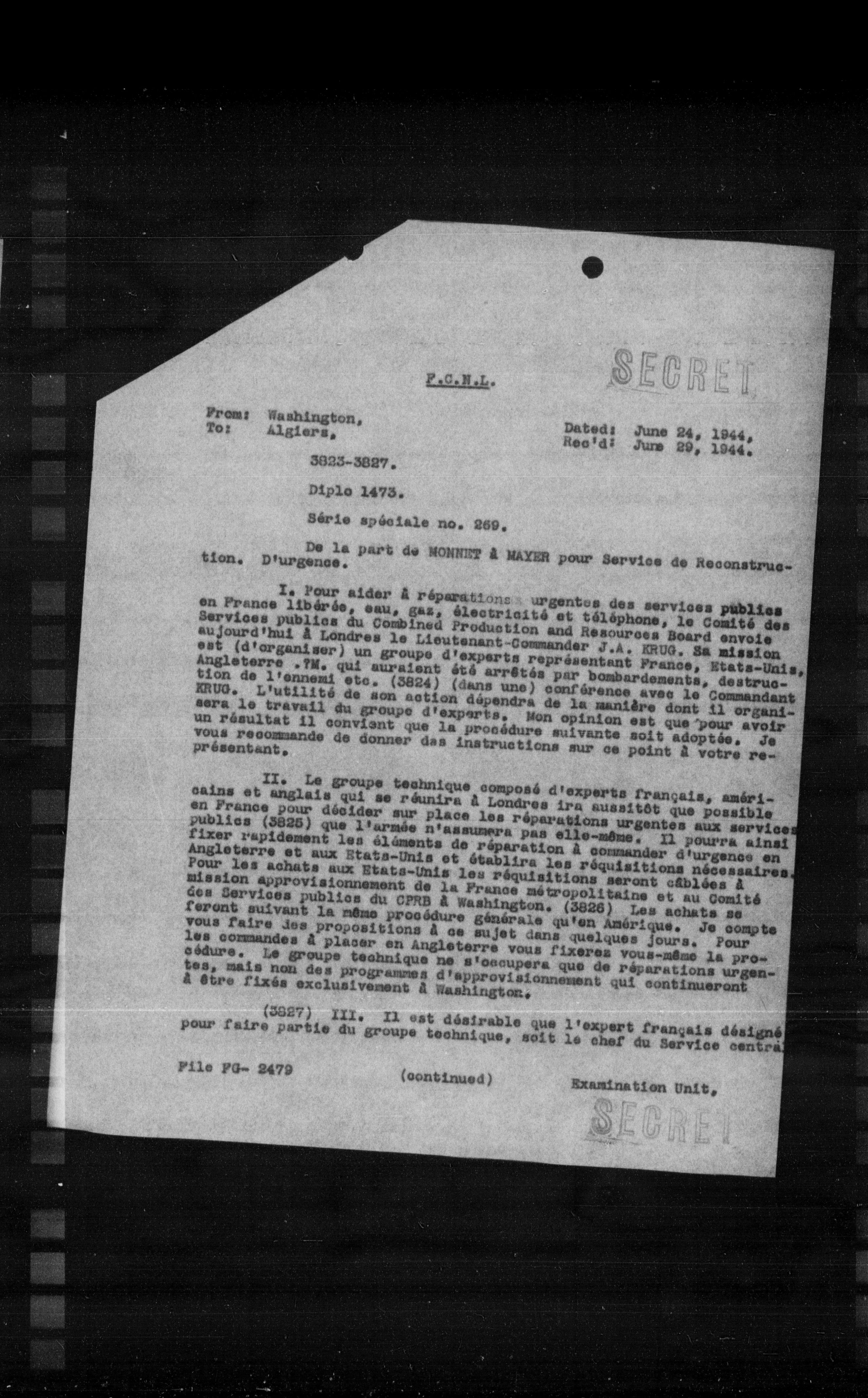I. Pour aider à réparations urgentes des services publics en France libérés, eau, gaz, électricité et téléphone, le Comité des Services publics du Combined Production and Resources Board envoie aujourd'hui à Londres le Lieutenant-Commander J.A. ERUG. Sa mission est (d'organiser) un groupe d'experts représentant France, États-Unis, Angleterre, l'UNI, qui auraient été arrêtés par bombardements, destruction de l'ennemi etc. (3824) (dans une) conférence avec le Commandant ERUG. L'utilité de son action dépendra de la manière dont il organisera le travail du groupe d'experts. Mon opinion est que pour avoir un résultat il convient que la procédure suivante soit adoptée. Je vous recommande de donner des instructions sur ce point à votre représentant.