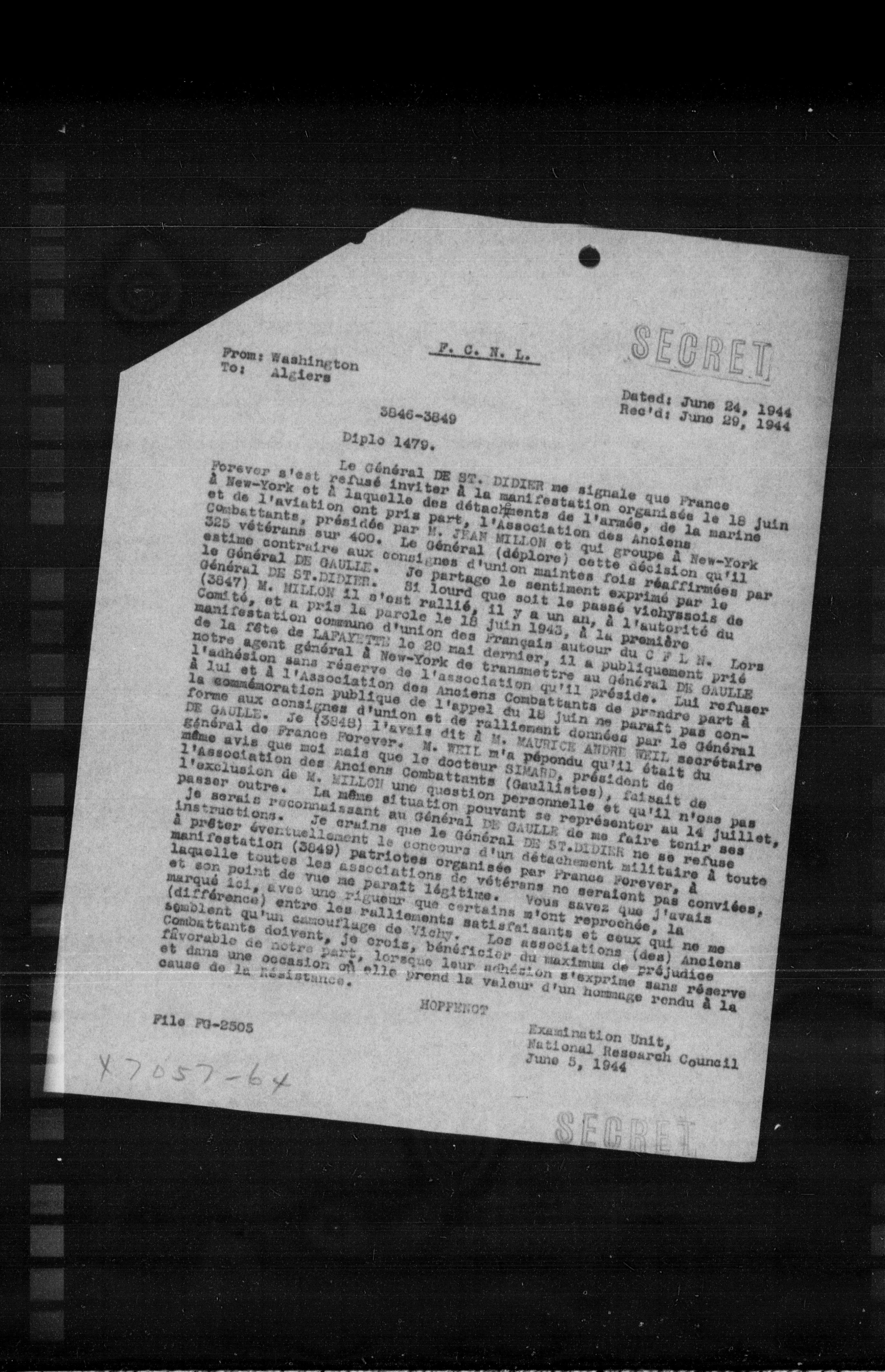 Le Général DE ST. DIDIER me signale que France Forever s'est refusé inviter à la manifestation organisée le 18 juin à New York et à laquelle des détachements de l'armée, de la marine et de l'aviation ont pris part, l'Association des Anciens Combattants, présidée par M. FRAN MILLON et qui groupe à New York 325 vétérans sur 400. Le Général (déplore) cette décision qu'il estime contraire aux consignes d'union maintes fois réaffirmées par le Général DE GAULLE. Je partage le sentiment exprimé par le Général DE ST. DIDIER. Si l'ourd que soit le passé vichyssois de [3847] M. MILLON il s'est rallié, il y a un an, à l'autorité du Comité, et a pris la parole le 18 juin 1943, à la première manifestation commune d'union des Français autour du C. J. H. Lors de la fête de LAPARTTE le 20 mai dernier, il a publiquement prié notre agent général à New York de transmettre au Général DE GAULLE l'adhésion sans réserve de l'Association qu'il préside. Lui et à l'Association des Anciens Combattants de prendre part à la commémoration publique de l'appel du 18 juin me paraît pas conforme aux consignes d'union et de ralliement données par le Général DE GAULLE. Je [3048] l'avais dit à M. MAURICE ASSUR UNIL secrétaire général de France Forever. M. MILLON m'a répondu qu'il était du même avis que moi mais que le docteur GIRARD, président de l'Association des Anciens Combattants (Gaullistes), faisait de l'exclusion de M. MILLON une question personnelle et qu'il n'ose pas passer outre. La même situation pourrait se représenter au 14 juillet. Je serais reconnaissant au Général DE GAULLE de me faire tenir ses instructions. Je crains que le Général DE ST. DIDIER ne se refuse à prêter éventuellement le concours d'un détachement militaire à toute manifestation [3049] patriotes organisée par France Forever, à laquelle toutes les associations de vétérans ne seraient pas conviées, et son point de vue ne paraît légitime. Vous savez que j'avais marqué ici, avec une rigueur que certains m'ont reprochée, la différence entre les ralliements satisfaisants et ceux qui ne me semblent qu'un camouflage de Vichy. Les associations [des] anciens combattants doivent, je crois, bénéficier du maximum de préjudice favorable de notre part, lorsque leur adhésion s'exprime sans réserve et dans une occasion où elle prend la valeur d'un hommage rendu à la cause de la Résistance.