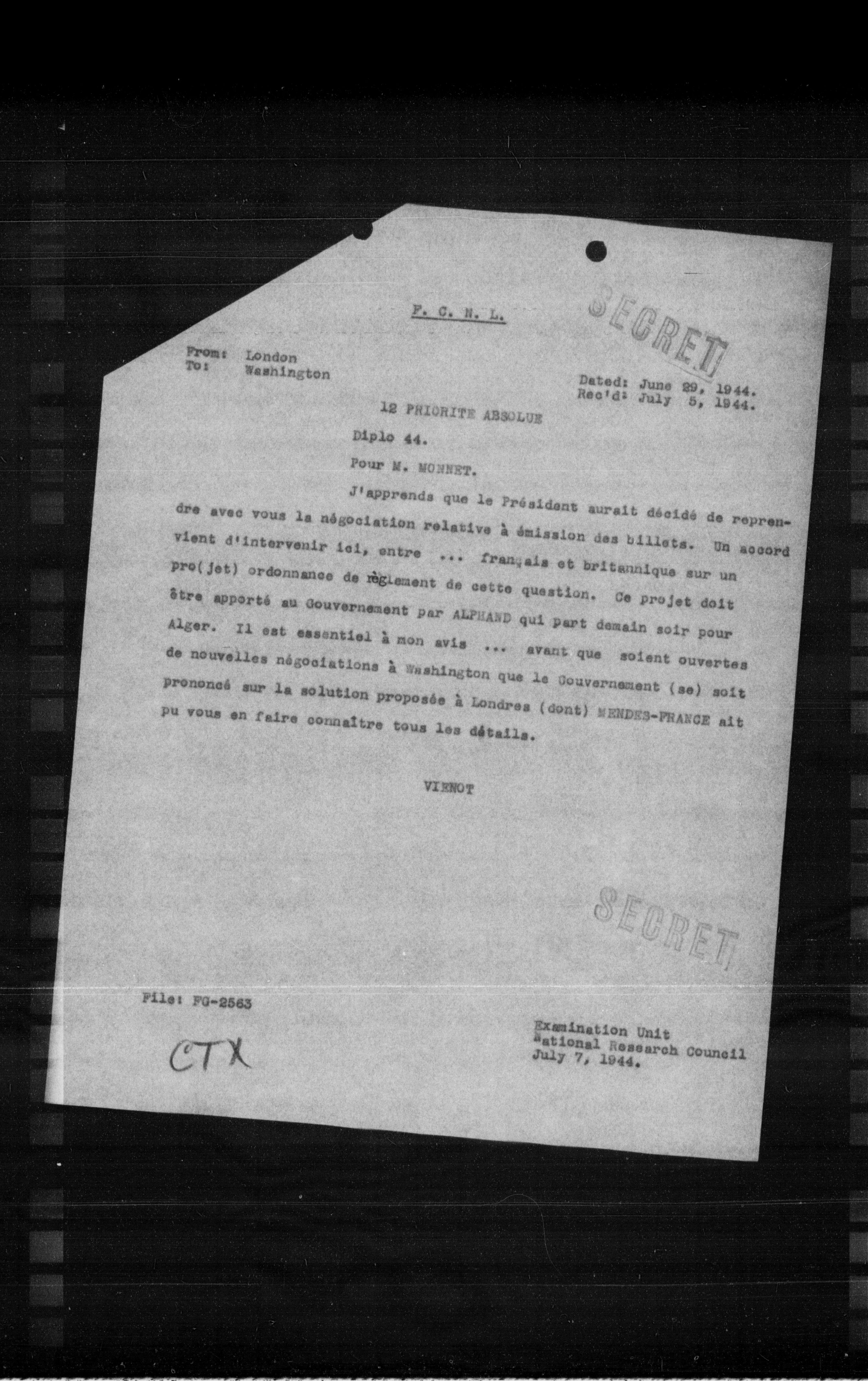 dre avec vous la négociation relative à émission des billets. Un accord vient d'intervenir ici, entre ... français et britannique sur un pro(jet) ordonnance de réglcment de cette question. Ce projet doit être apporté au Gouvernement par ALPHAND qui part demain soir pour Alger. Il est essentiel à mon avis ... avant que soient ouvertes de nouvelles négociations à Washington que le Gouvernement (se) soit prononcé sur la solution proposée à Londres (dont) MENDES-PHANCE ait pu vous en faire connaître tous les détails.