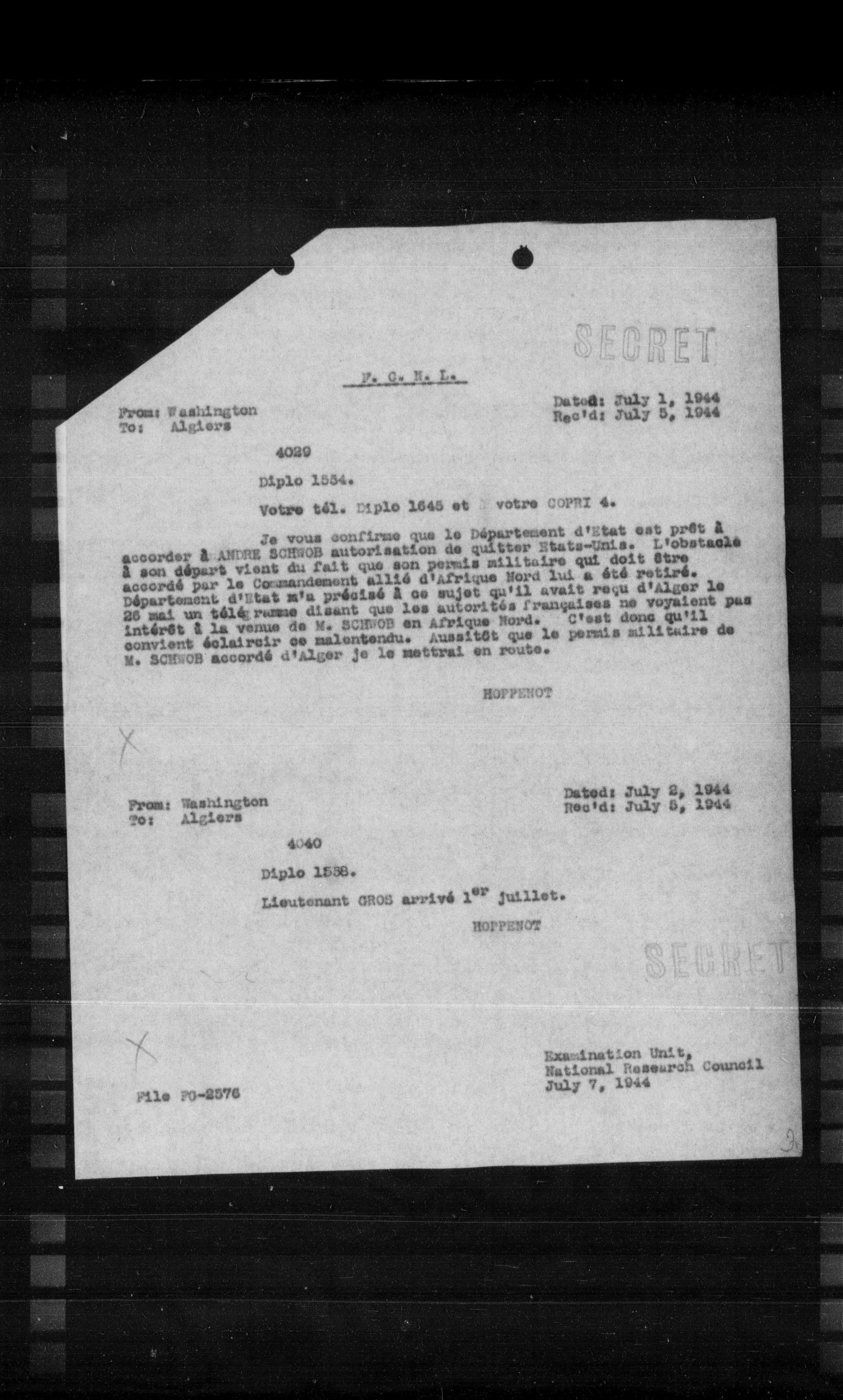 Je vous confirme que le Département d'Etat est prêt à accorder à AHME SCHWOB autorisation de quitter Etats-Unis. L'obstacle a son départ vient du fait que son permis militaire qui doit être accordé par le Commandement allié d'Afrique Nord lui a été retiré. Le Département d'Etat m'a précisé à ce sujet qu'il avait reçu d'alger le 25 mai un téléphone disant que les autorités françaises ne voyaient pas intérêt à la venue de M. SCHWOB en Afrique Nord. C'est donc qu'il convient éclaircir ce malentendu. Aussitôt que le permis militaire de M. SCHWOB accordé d'alger je le mettrai en route.