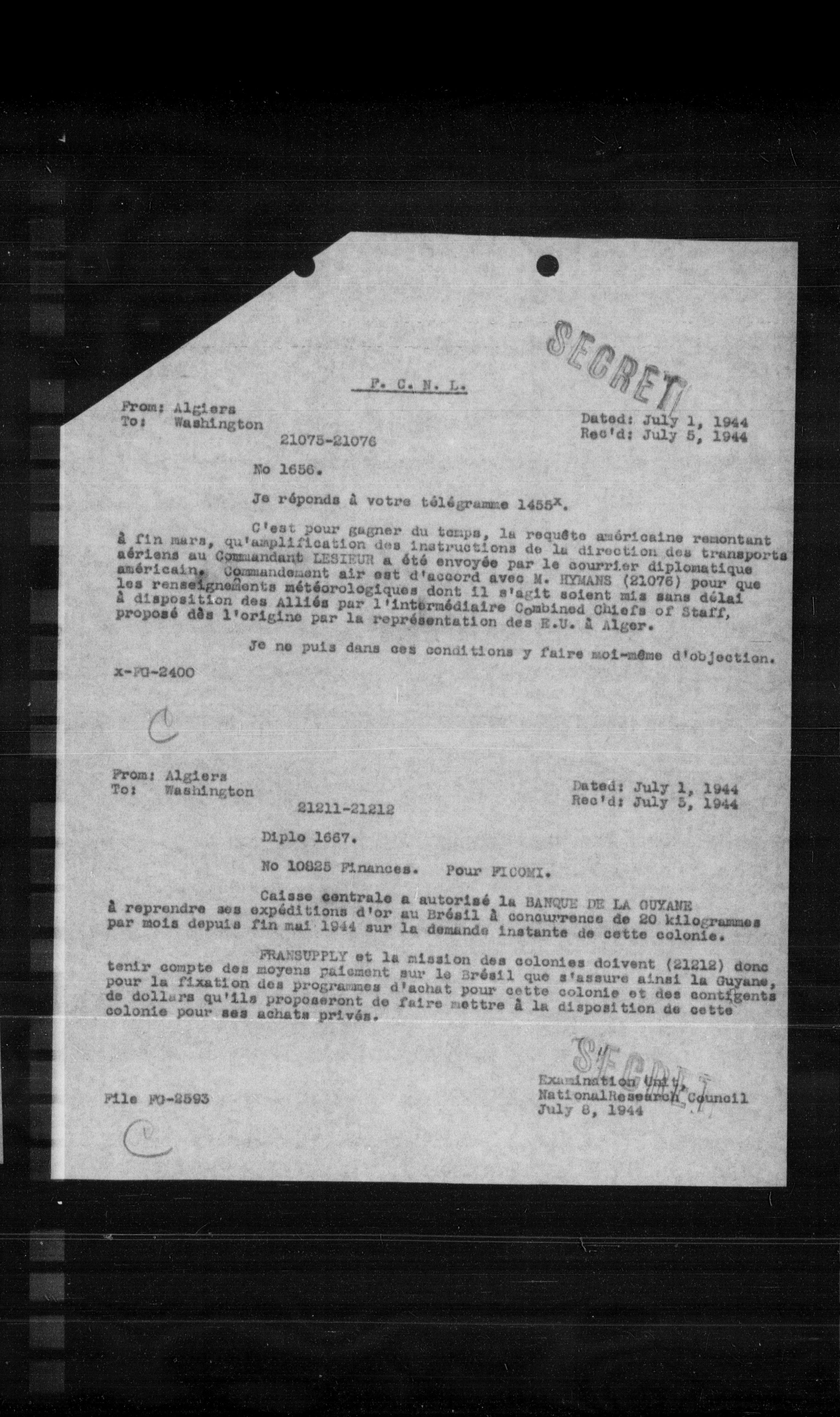 C'est pour gagner du temps, la requête américaine remontant à fin mars, qu'amplification des instructions de la direction des transports aériens au Commandant LESIEUR a été envoyée par le courrier diplomatique américain. Commandement air est d'accord avec N. HYMANS (21076) pour que les renseignements météorologiques dont il s'agit soient mis sans délai à disposition des Alliés par l'intermédiaire Combined Chiefs of Staff, proposé dès l'origine par la représentation des E.U. à Alger.