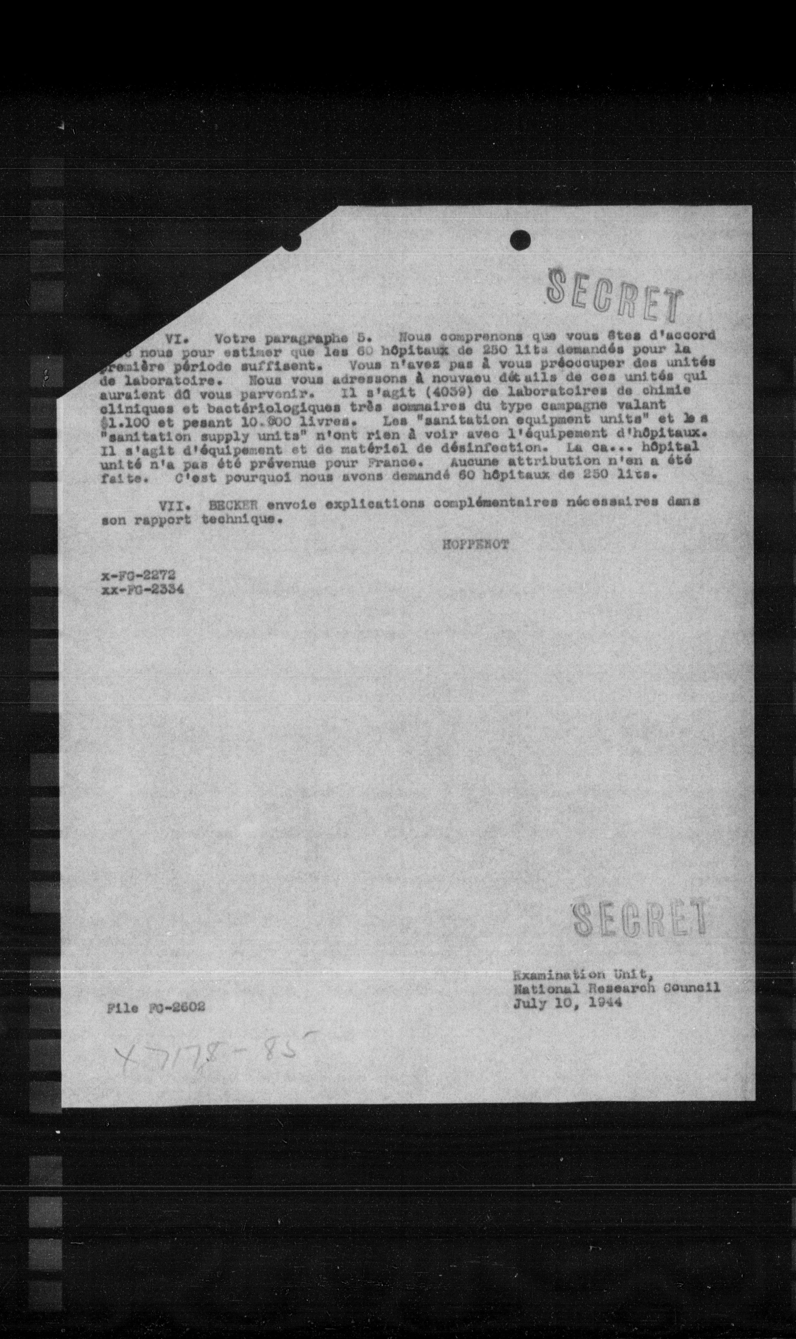 meinère période suffisent. Vous n'avez pas à vous préoccuper des unités de laboratoire. Nous vous adressons a nouveau dét alle de ces unités qui auraient da vous parvenir. Il s'agit (4039) de laboratoires de chimie cliniques et bactériologiques très sommaires du type campagne valant 51.100 et pesant 10.900 livres. Les "sanitation equipment units" et le a "sanitation supply units" n'ont rien a voir avec l'équipement d'hôpitaux. Il s'agit d'équipement et de matériel de désinfection. La ca... hôpital unité n'a pas été prévenue pour France. Aucune attribution n'en a été faite. C'est pourquoi nous avons demandé 60 hopitaux de 250 lits.