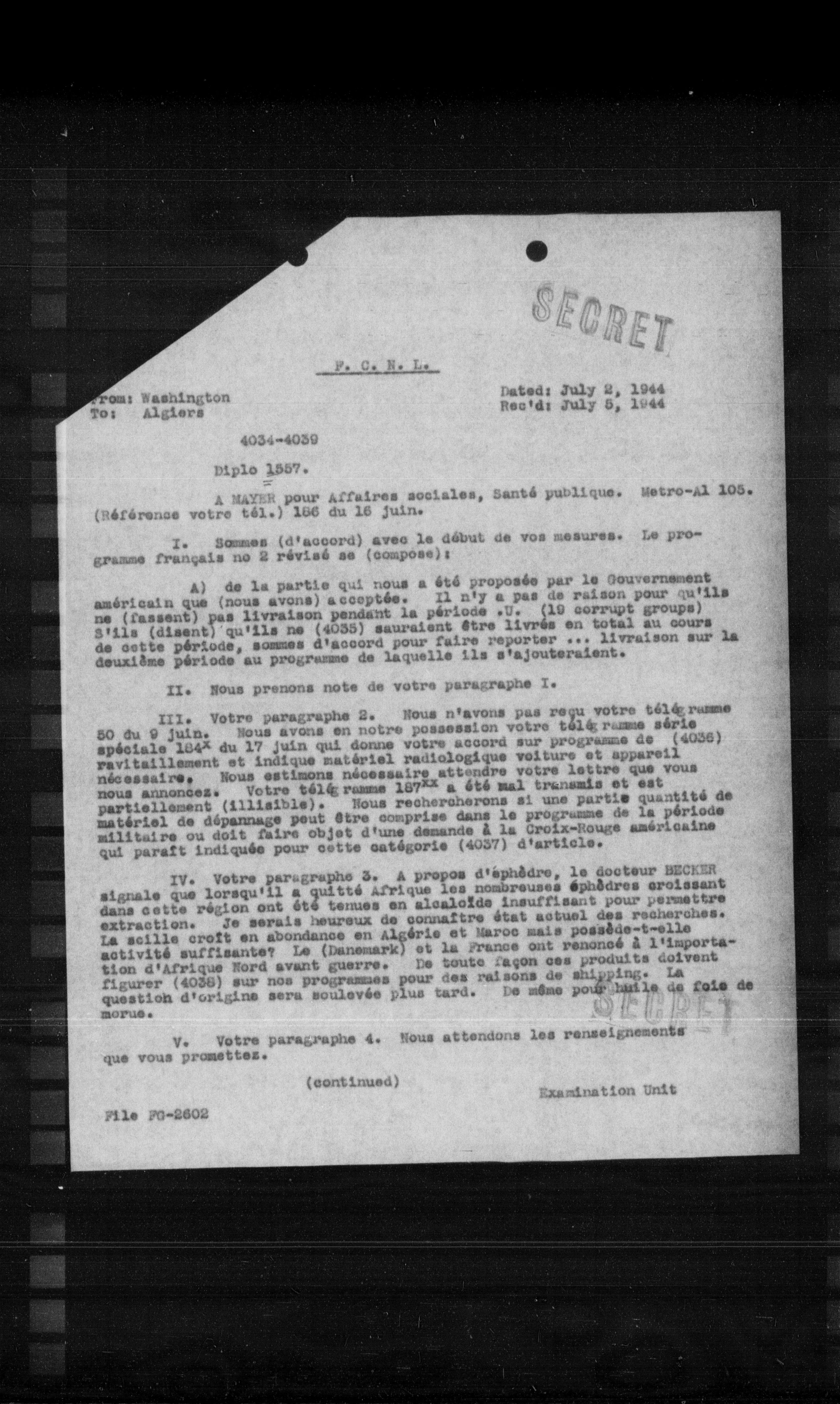 III. Votre paragraphe 2. Nous n'avons pas reçu votre téléphone 50 du 9 juin. Nous avons en notre possession votre téléphone sérieu spécialisé 164 du 17 juin qui donne votre accord sur la programme de (4036) ravitaillement et indique matériel radiologique voiture et appareil nécessaire. Nous estimons nécessaire attendre votre lettre que vous nous annoncés. Votre téléphone 167 a été mal transmis et est partiellement (illisible). Nous rechercherons si une partie quantité de matériel de dépannage peut être comprise dans le programme de la période militaire ou doit faire objet d'une demande à la Croix-Rouge américaine qui paraît indiquée pour cette catégorie (4037) d'article.