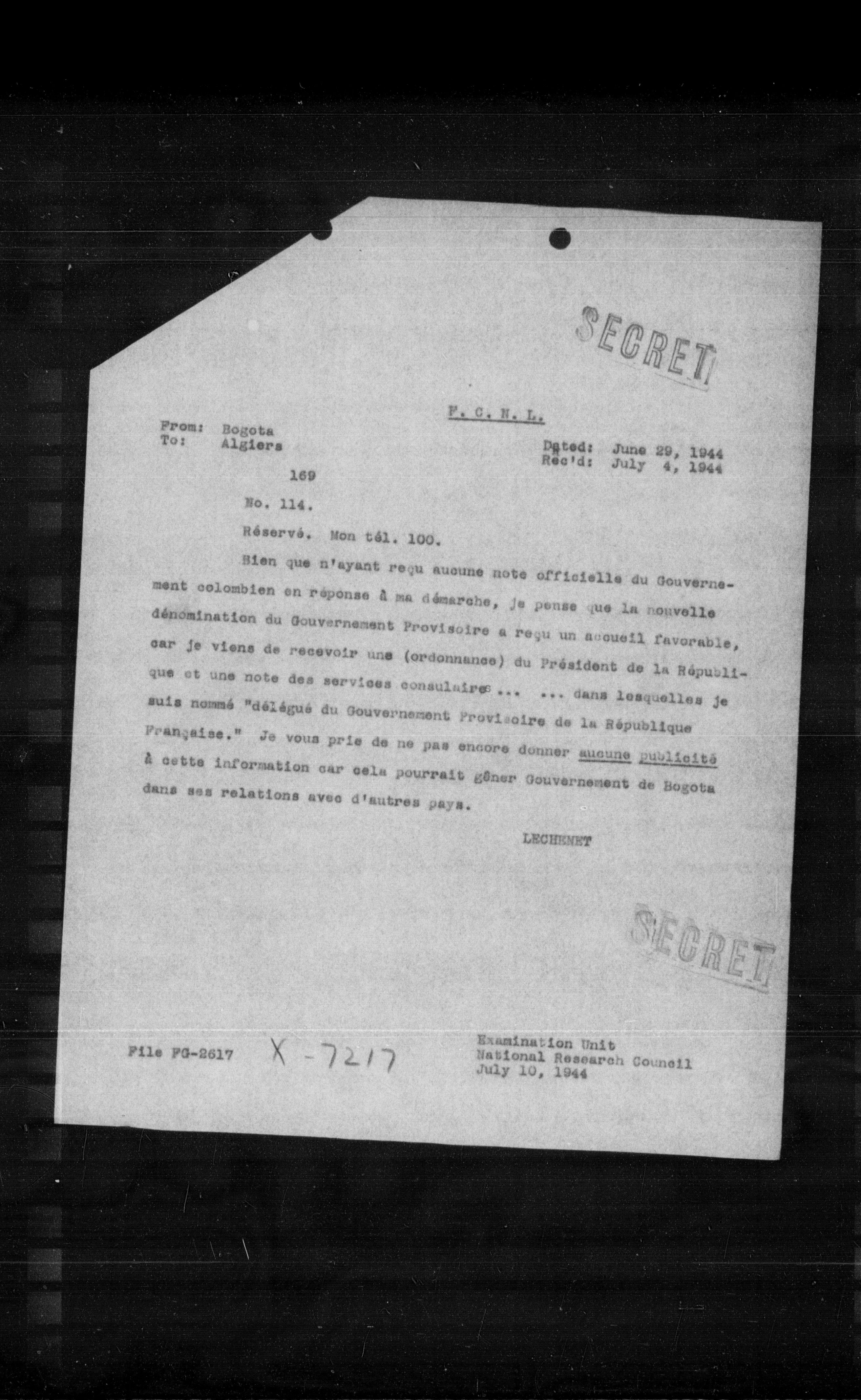 Bien que n'ayant reçu aucune note officielle du Gouvernement colombien en réponse à ma démarche, je pense que la nouvelle dénomination du Gouvernement Provisoire a reçu un a coueil favorable, car je viens de recevoir une (ordonnance) du Président de la République et une note des services consulaire ... ... dans lesquelles je suis nommé "délégué du Gouvernement Provisoire de la République Française." Je vous prie de ne pas encore donner aucune publicité à cette information car cela pourrait gêner Gouvernement de Bogota dans ses relations avec d'autres pays.