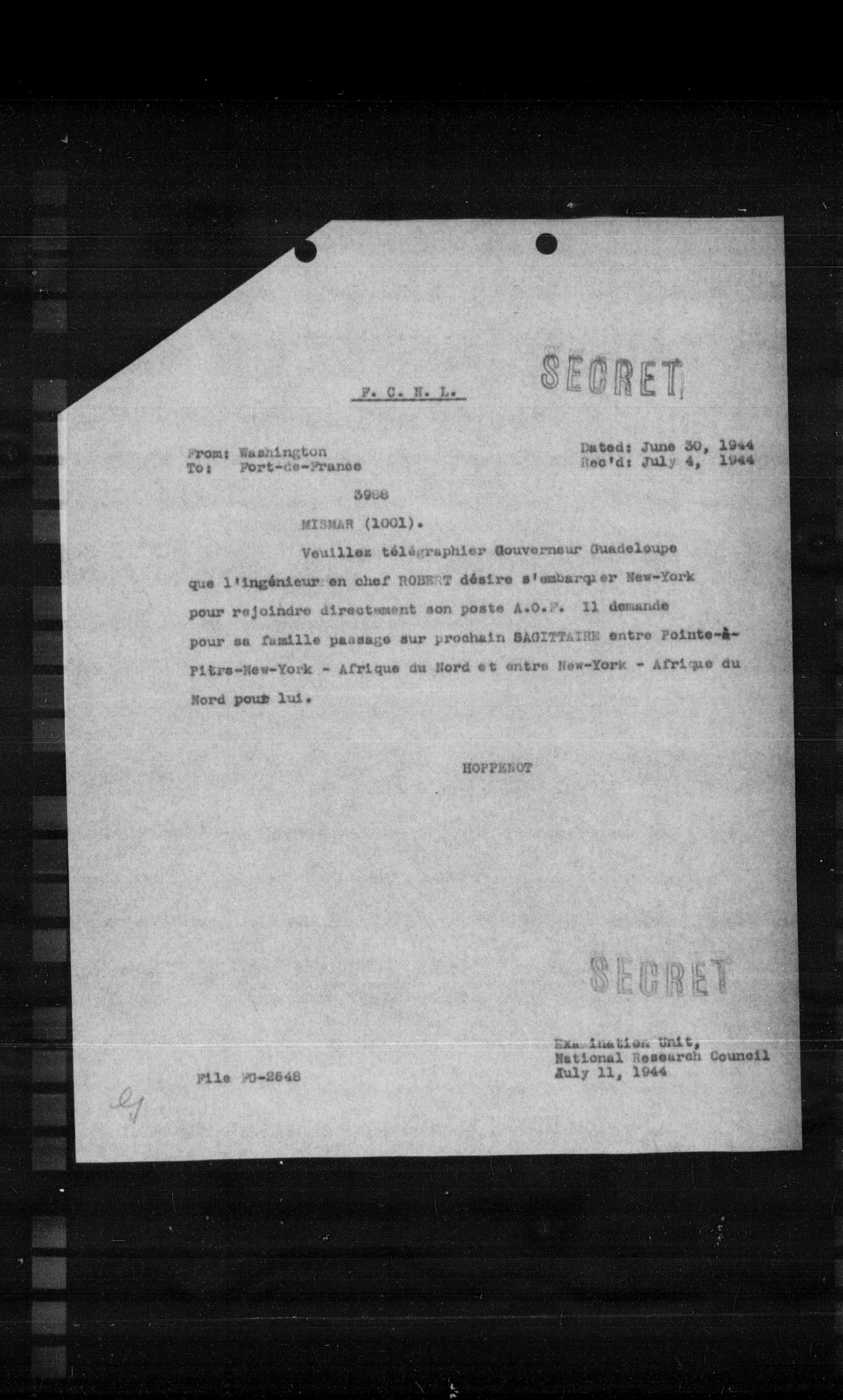 Veuillez télégraphier Gouverneur Guadeloupe que l'ingénieur en chef ROBERT désire s'embarquer New-York pour rejoindre directement son poste A.O.P. Il demande pour sa famille passage sur prochain BAGITTAIRE entre Fainte-1-Pitre-New-York - Afrique du Nord et entre New-York - Afrique du Nord poub lui.