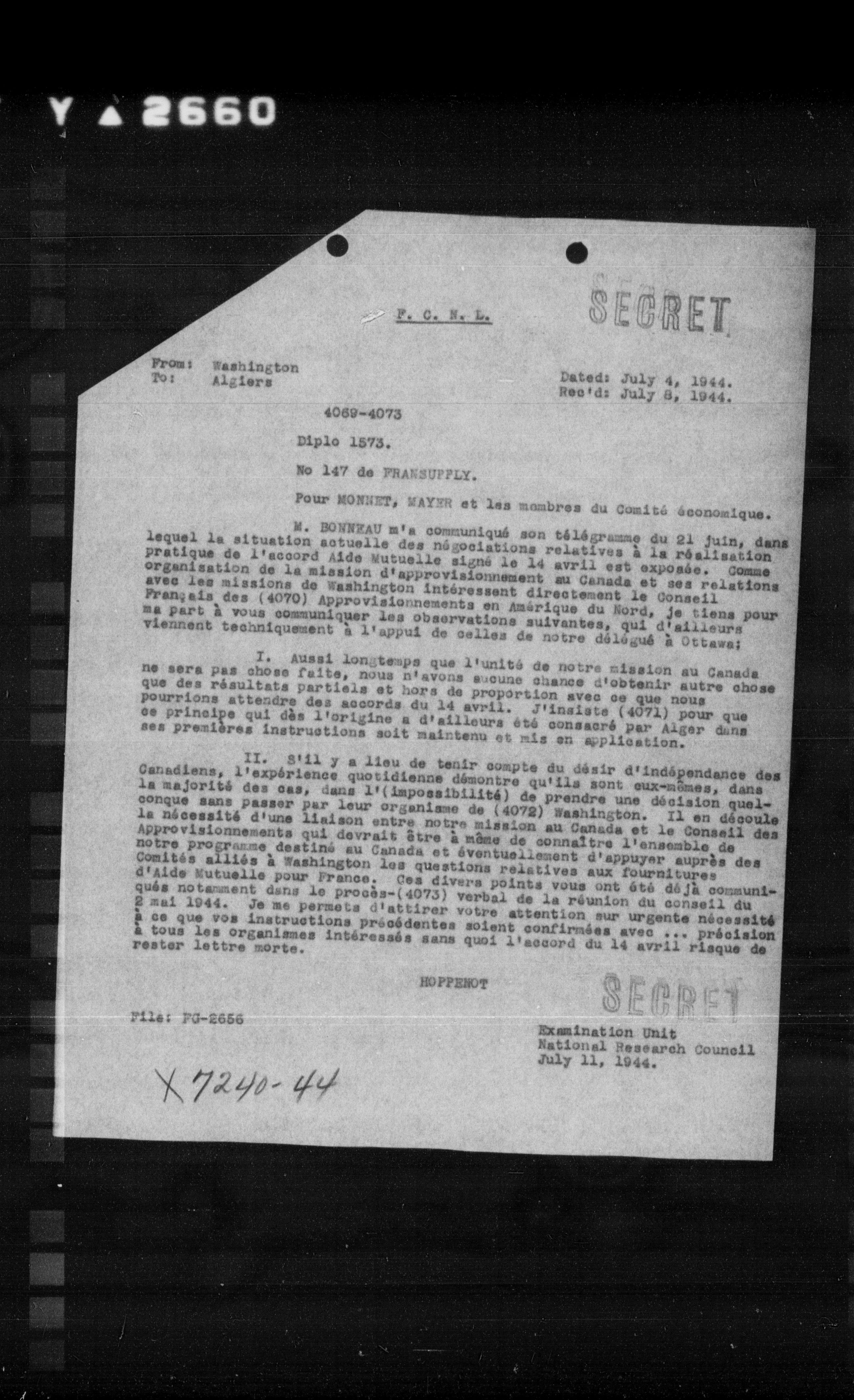 II. S'il y a lieu de tenir compte du désir d'indépendance des Canadiens, l'expérience quotidienne démontre qu'ils sont eux-mêmes, dans la majorité des cas, dans l'impossibilité de prendre une décision quelconque sans passer par leur organisme de (4072) Washington. Il en découle la nécessité d'une liaison entre notre mission au Canada et le Conseil des Approvisionnements qui devrait être à même de connaître l'ensemble de notre programme destiné au Canada et éventuellement d'appuyer auprès des Comités alliés à Washington les questions relatives aux fournitures d'Alde Mutuelle pour France. Ces divers points vous ont été déjà communiqués notamment dans le procès-(4073) verbal de la réunion du conseil du 2 mai 1944. Je me permets d'attirer votre attention sur urgente nécessité de ce que vos instructions précédentes soient confirmées avec ... précision à tous les organismes intéressés sans quoi l'accord du 14 avril risque de rester lettre morte.