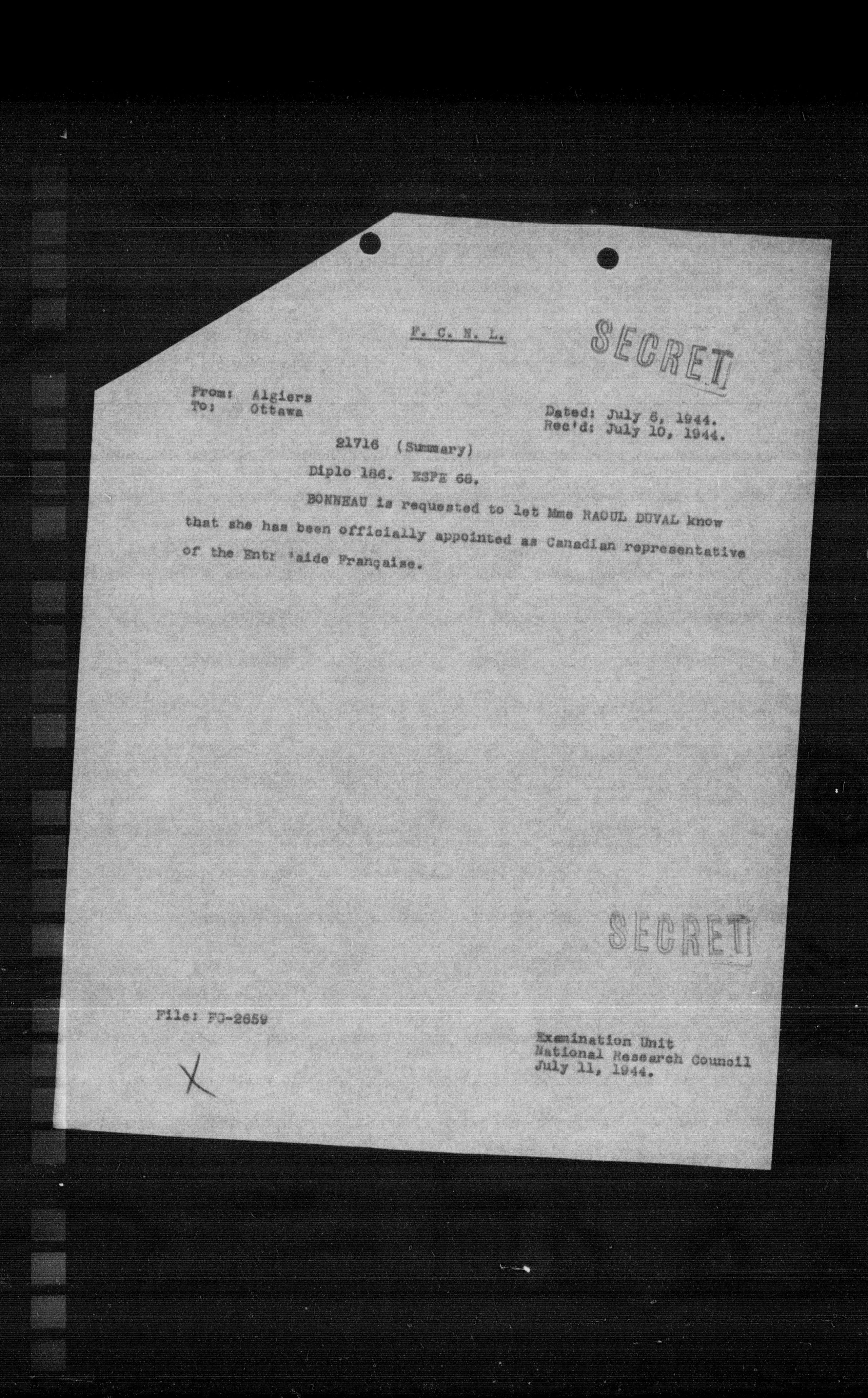 BONNEAU is requested to let Mrs RAOUL DUVAL know that she has been officially appointed as Canadian representative of the Entry 'aide Frangaisa.