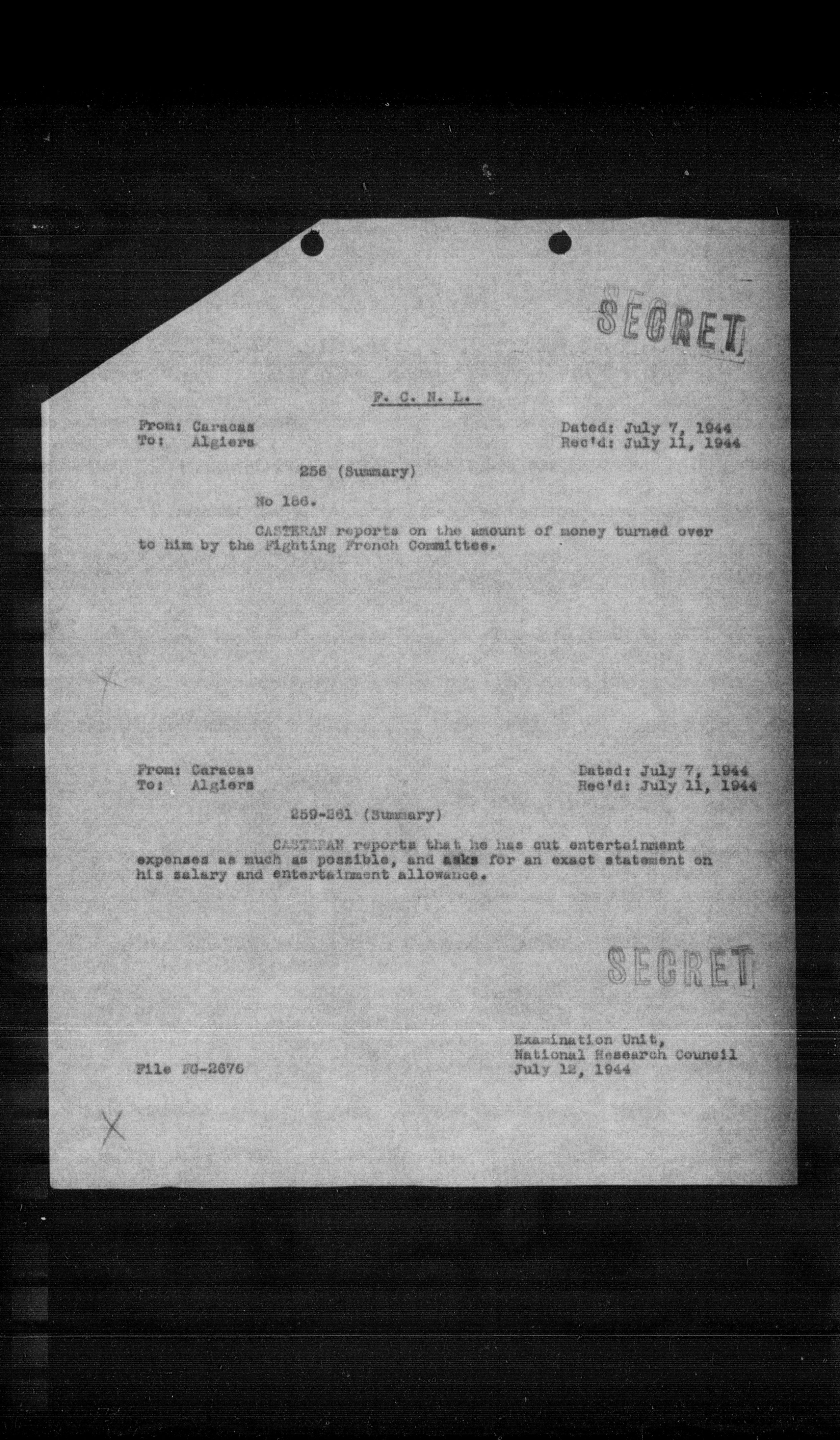 CASTENAN reports on the amount of money turned over to him by the Fighting French Committee.