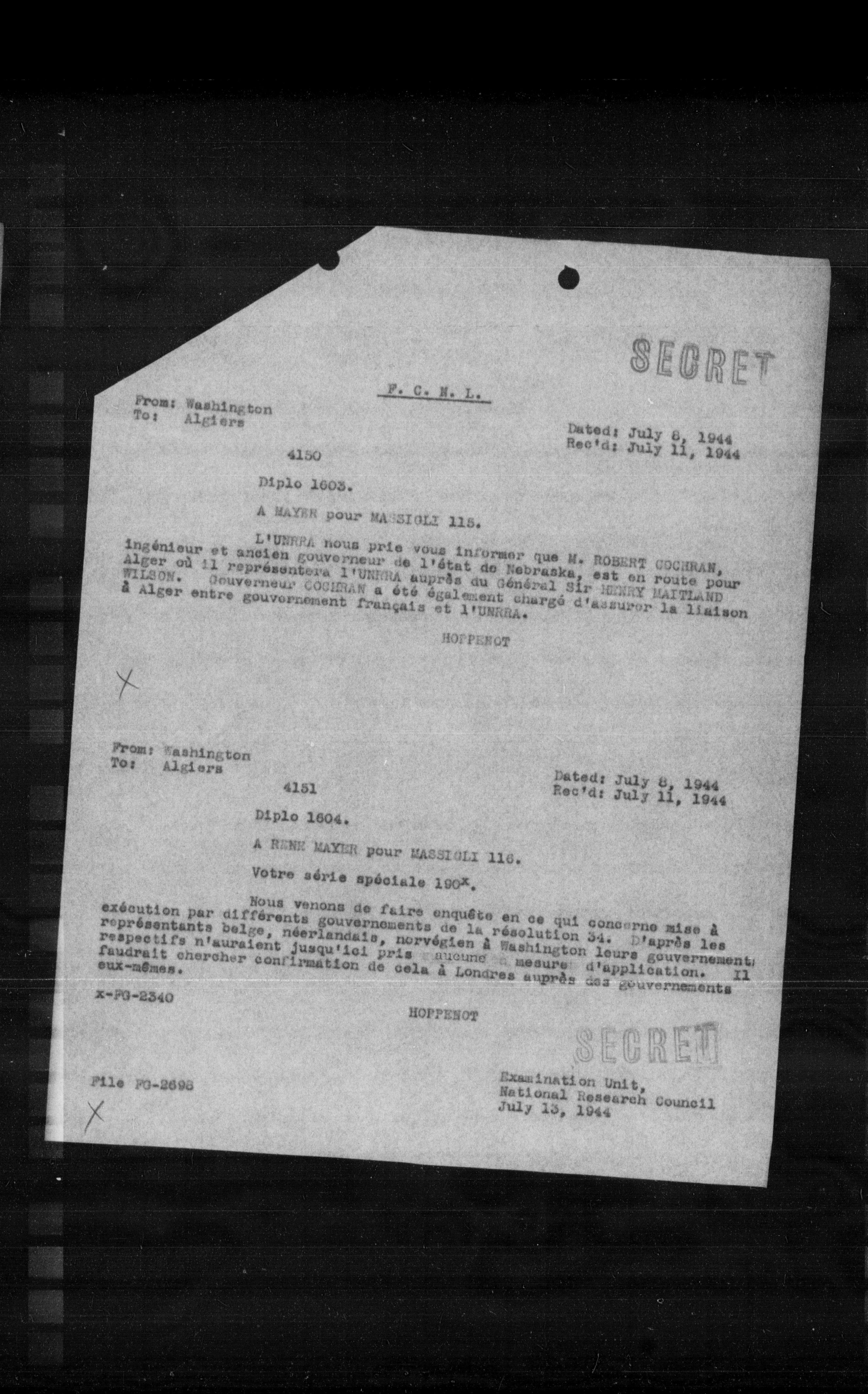 L'UNERA nous prie vous informer que M. ROBERT COCHRAN, ingénieur et ancien gouverneur de l'état de Nebraska, est en route pour Alger où il représentera l'UNERA auprès du Général Sir SERRY MAITLAND TILSON. Gouverneur COCHRAN a été également chargé d'assurer la liaison à Alger entre gouvernement français et l'UNERA.