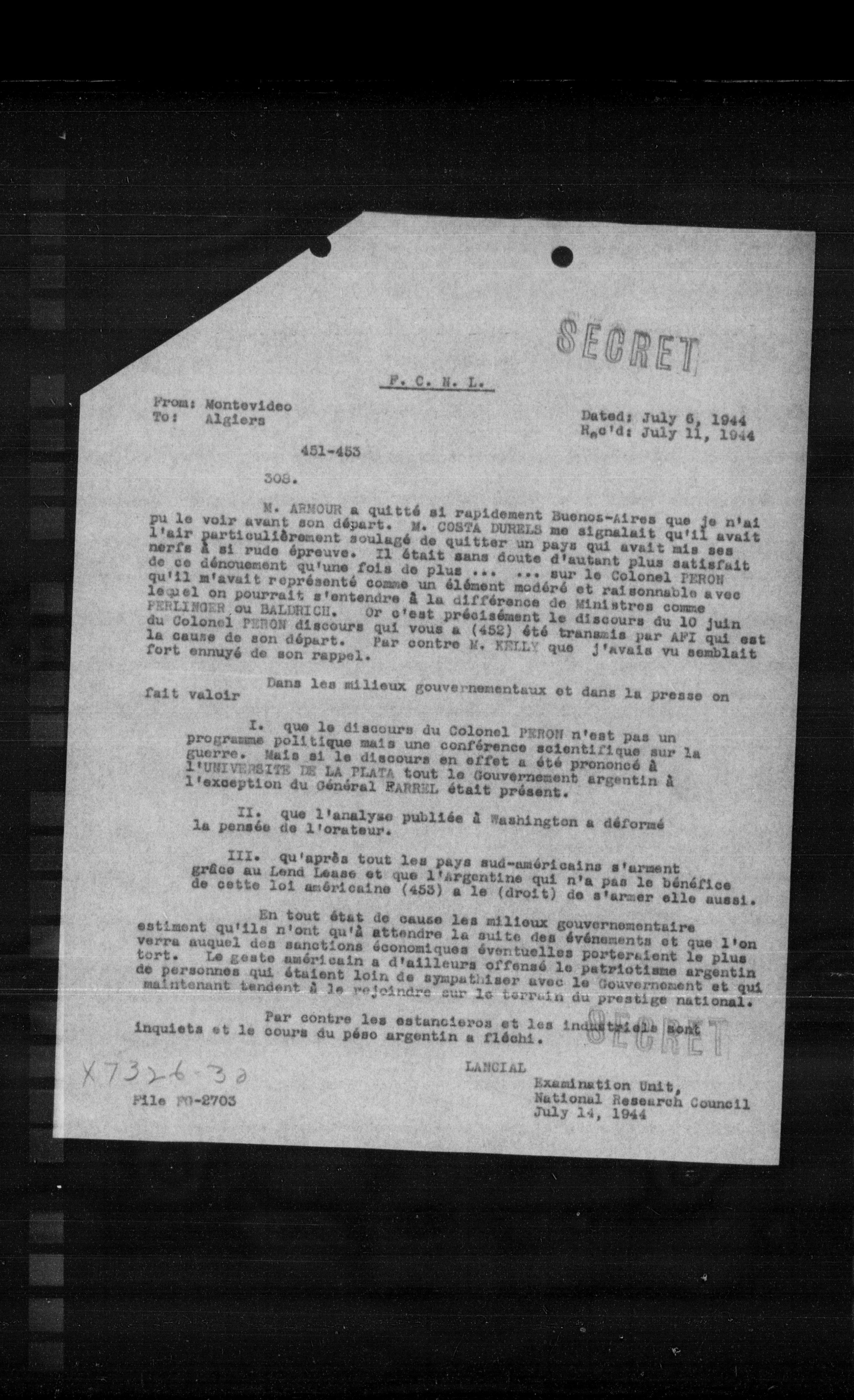 M. ARNOUR a quitté si rapidement Buenos-Aires que je n'ai pu le voir avant son départ. M. COSTA DURELS me signalait qu'il avait l'air particulièrement soulagé de quitter un pays qui avait mis ses nerfs à si rude épreuve. Il était sans doute d'autant plus satisfait de ce dénouement qu'une fois de plus ... sur le Colonel PERON qu'il m'avait représenté comme un élément modéré et raisonnable avec lequel on pourrait s'entendre à la différence de Ministres comme FERLINIER ou BALANICE. Or c'est précisément le discours du 10 juin du Colonel PERON discours qui vous a (452) été transmis par API qui est la cause de son départ. Par contre M. KELLY que j'avais vu semblait fort ennuyé de son rappel.