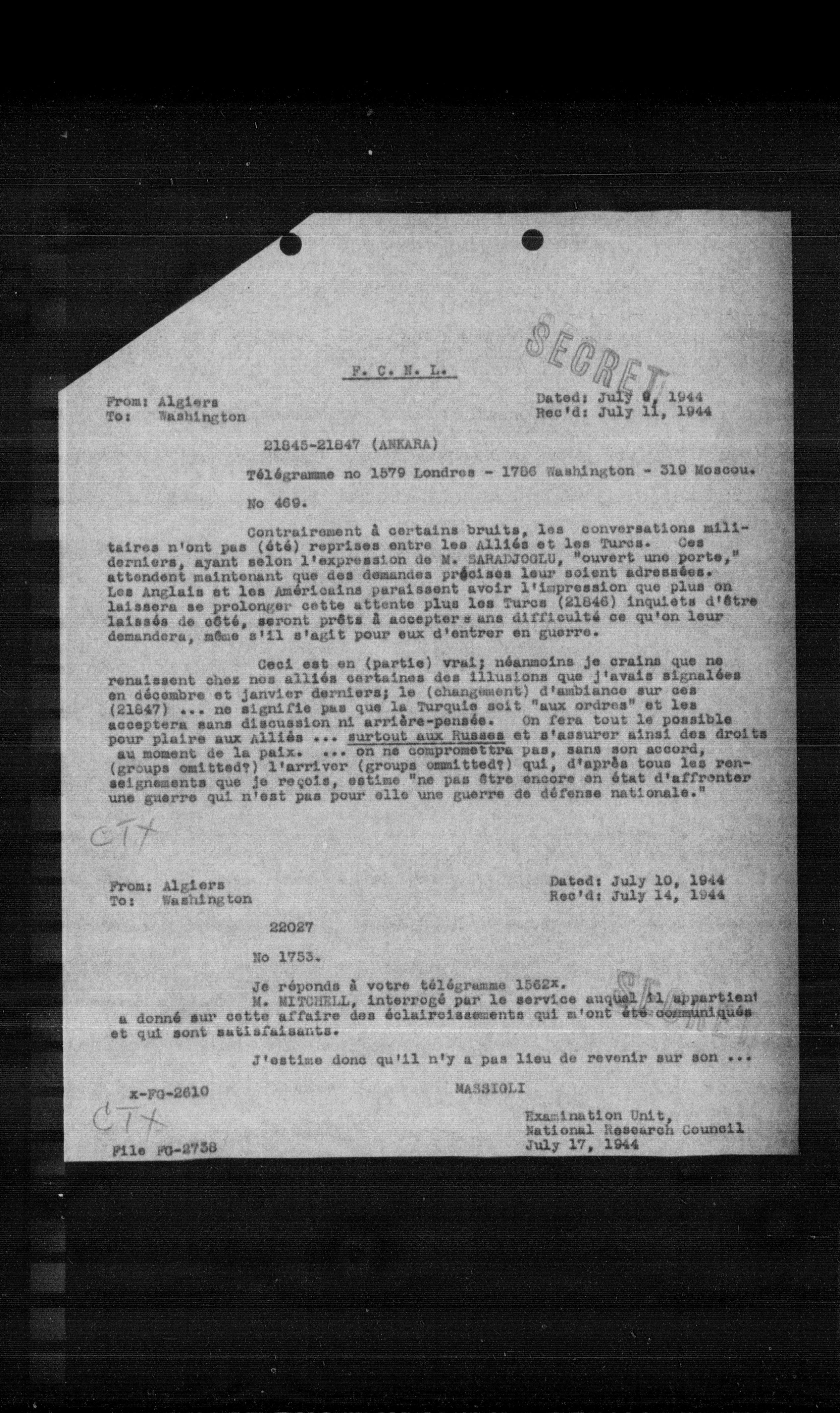 Contrairement à certains bruits, les conversations militaires n'ont pas (été) reprises entre les alliés et les Turcs. Ces derniers, ayant selon l'expression de M. SARAHJOGLU, "ouvert une porte," attendent maintenant que des demandes précises leur soient adressées. Les Anglais et les Américains paraissent avoir l'impression que plus on laissera se prolonger cette attente plus les Turcs (21846) inquiets d'être laissés de côté, seront prêts à accepter sans difficulté ce qu'on leur demandera, même s'il s'agit pour eux d'entrer en guerre.