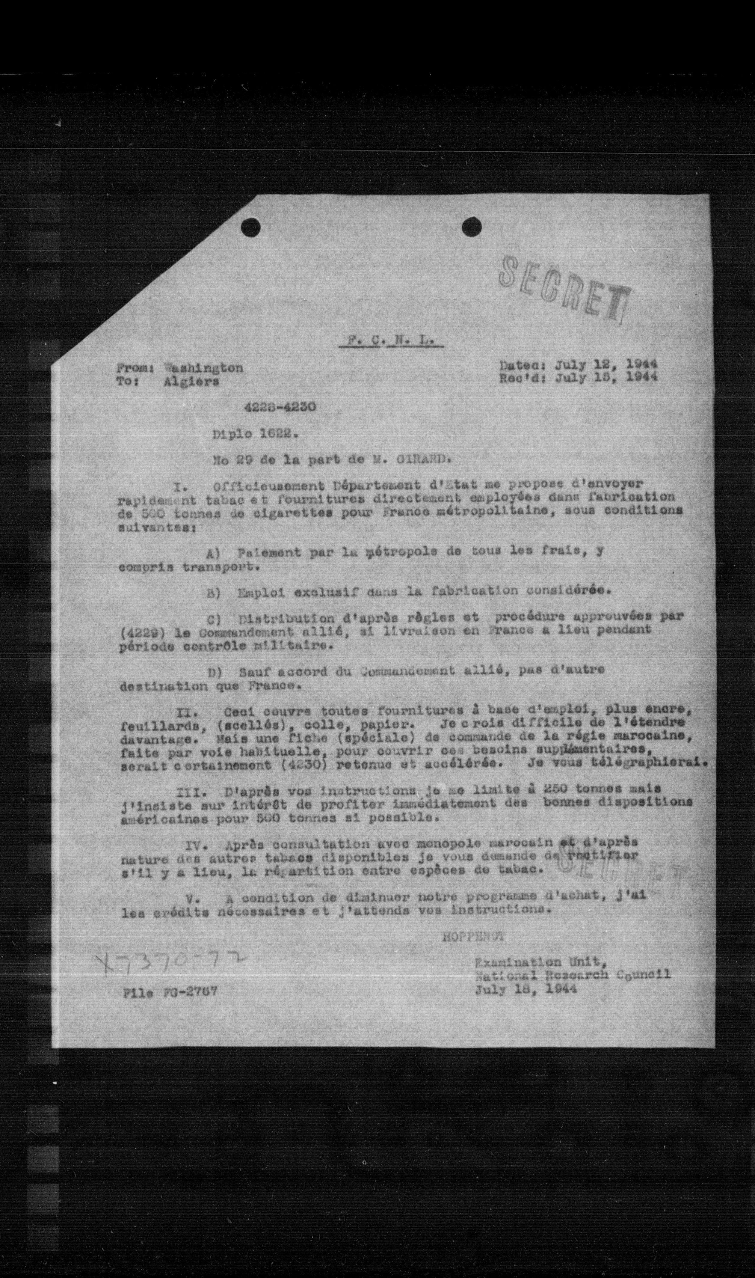 I. Officieusement Département d'État me propose d'envoyer rapidement tabac et fournitures directement employées dans fabrication de 500 tonnes de cigarettes pour France métropolitaine, sous conditions suivantes: