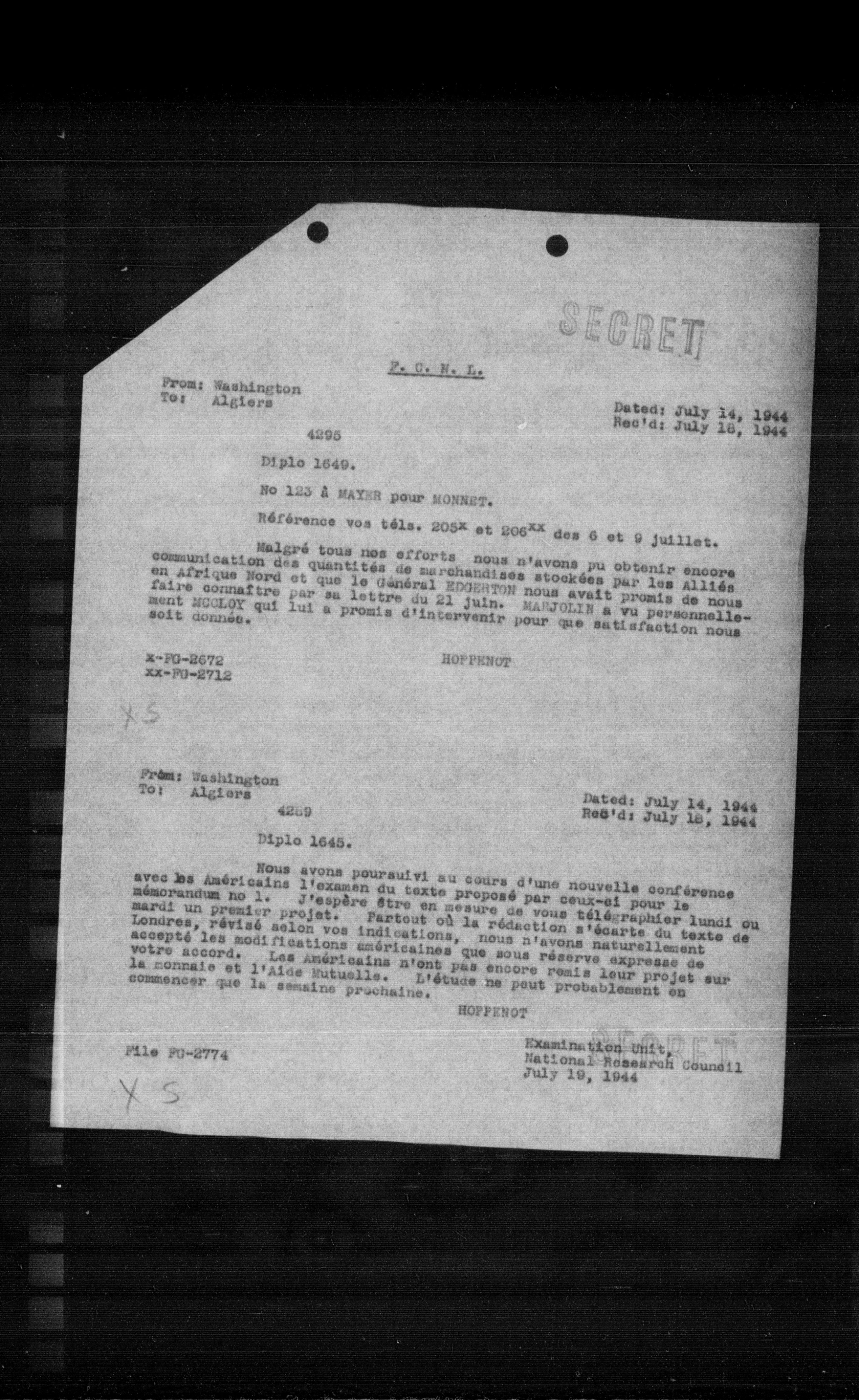 Malgré tous nos efforts nous n'avons pu obtenir encore communication des quantités de marchandises stockées par les alliés en Afrique Nord et que le Général REGERTON nous avait promis de nous faire connaitre par sa lettre du 21 juin. MARJOLIN a vu personnellement MOLLOY qui lui a promis d'intervenir pour que satisfaction nous soit donnée.
