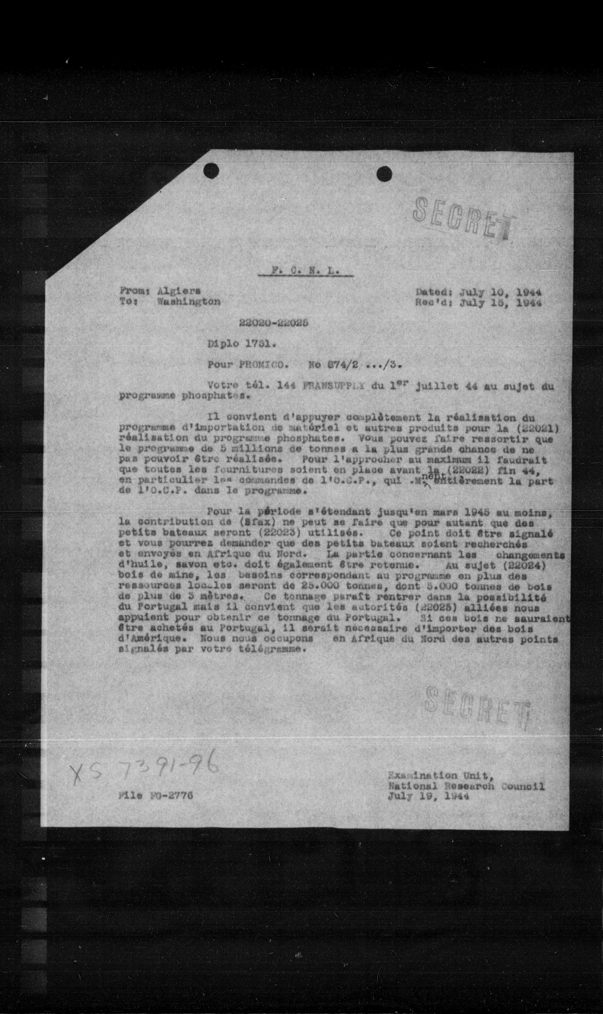 Votre tél. 144 FRANSUPPLY du 1er juillet 44 au sujet du programme phosphate.