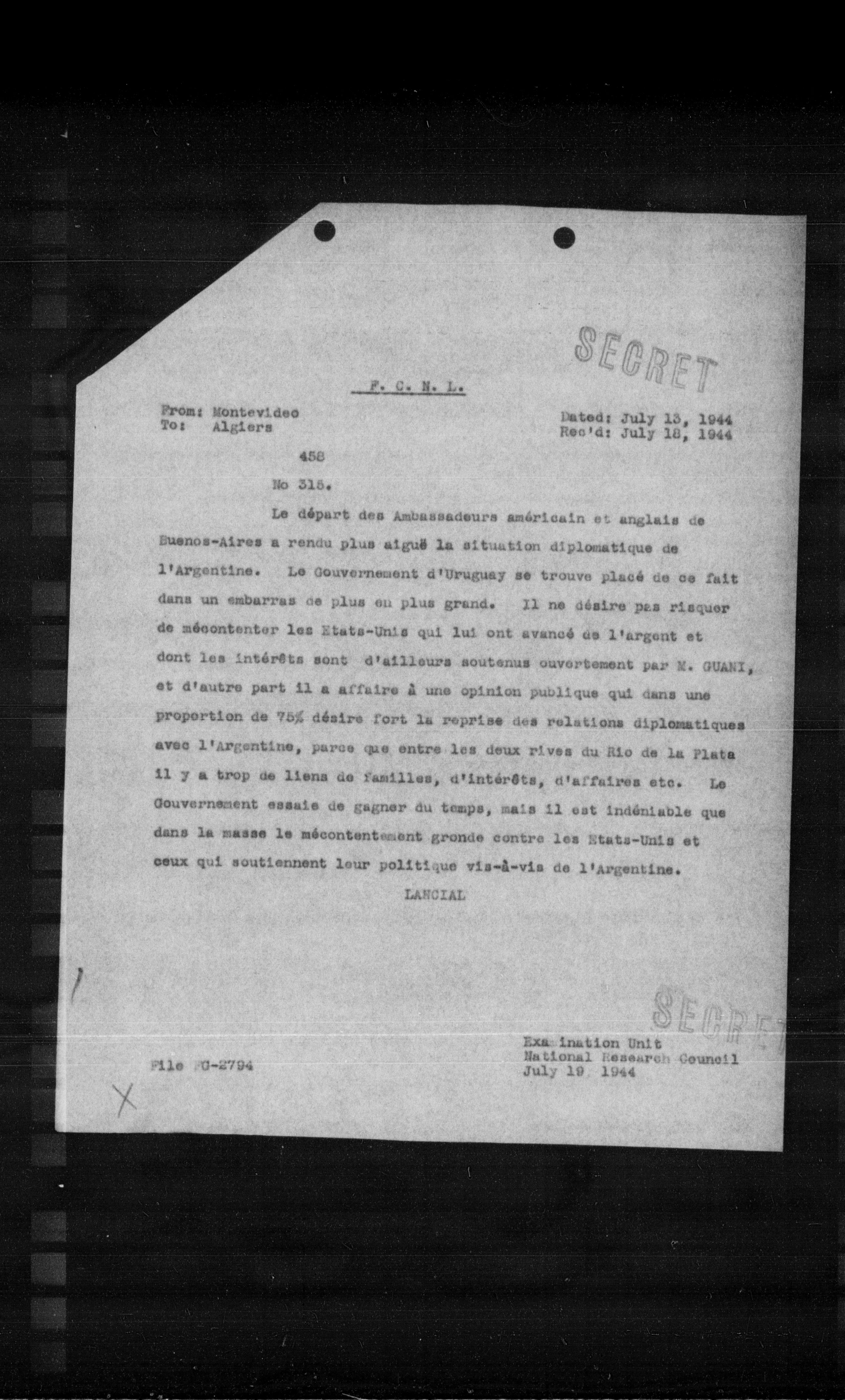 Le départ des Ambassadeurs américain et anglais de Buenos-Aires a rendu plus aigue la situation diplomatique de l'Argentine. Le Gouvernement d'Uruguay se trouve placé de ce fait dans un embarras de plus en plus grand. Il ne désire pas risquer de mécontenter les Etats-Unis qui lui ont avancé de l'argent et dont les intérêts sont d'ailleurs soutenus ouvertement par E. GUANI, et d'autre part il a affaire à une opinion publique qui dans une proportion de $75 \%$ désire fort la reprise des relations diplomatiques avec l'argontine, parce que entre les deux rives du Rio de la Plate il y a trop de liens de familles, d'intérêts, d'affaires etc. Le Gouvernement essaie de gagner du temps, mais il est indéniable que dans la masse le mécontentement gronde contre les Etats-Unis et ceux qui soutiennent leur politique vis-à-vis de l'Argentine.