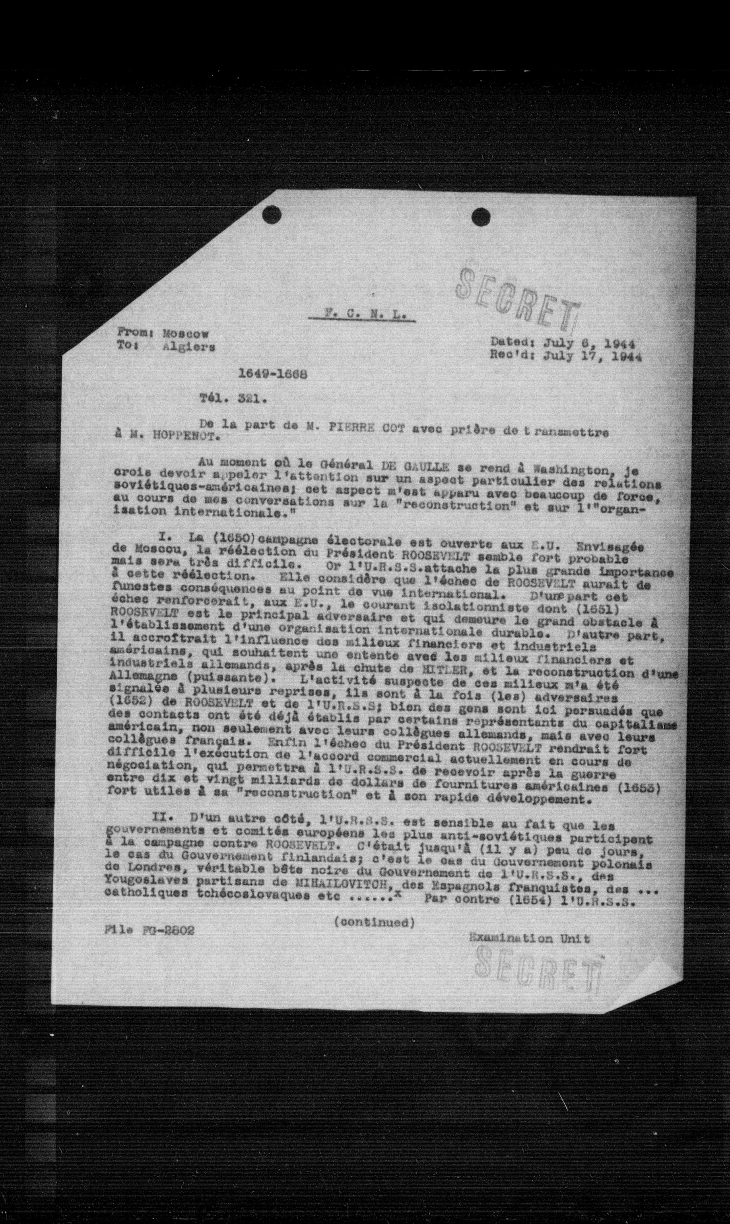 I. La (1650) campagne électorale est ouverte aux E.U. Envisag6e de Moscou, la réélection du Président ROOSEVELT semble fort probable mais sera très difficile. Or l'U.R.S.S.attache la plus grande importance à cette réélection. Elle considère que l'échec de ROOSEVELT aurait de funestes conséquences au point de vue international. D'un part cet échec renforcerait, aux E.U., le courant isolationniste dont (1651) ROOSEVELT est le principal adversaire et qui demeure le grand obstacle à l'établissement d'une organisation internationale durable. D'autre part, il accroîtrait l'influence des milieux financiers et industriels américains, qui souhaitent une entente avec les milieux financiers et industriels allemands, après la chute de MITLER, et la reconstruction d'une Allemagne (puissante). L'activité suspecte de ces milieux m'a été signalée à plusieurs reprises, ils sont à la fois (les) adversaires (1652) de ROOSEVELT et de l'U.R.S.S; bien des gens sont ici persuadés que des contacts ont été déjà établis par certains représentants du capitalism américain, non seulement avec leurs collègues allemands, mais avec leurs collègues français. Enfin l'échec du Président ROOSEVELT rendrait fort difficile l'exécution de l'accord commercial actuellement en cours de négociation, qui permettra à l'U.R.S.S. de recevoir après la guerre entre dix et vingt milliards de dollars de fournitures américaines (1653) fort utiles à sa "reconstruction" et à son rapide développement.