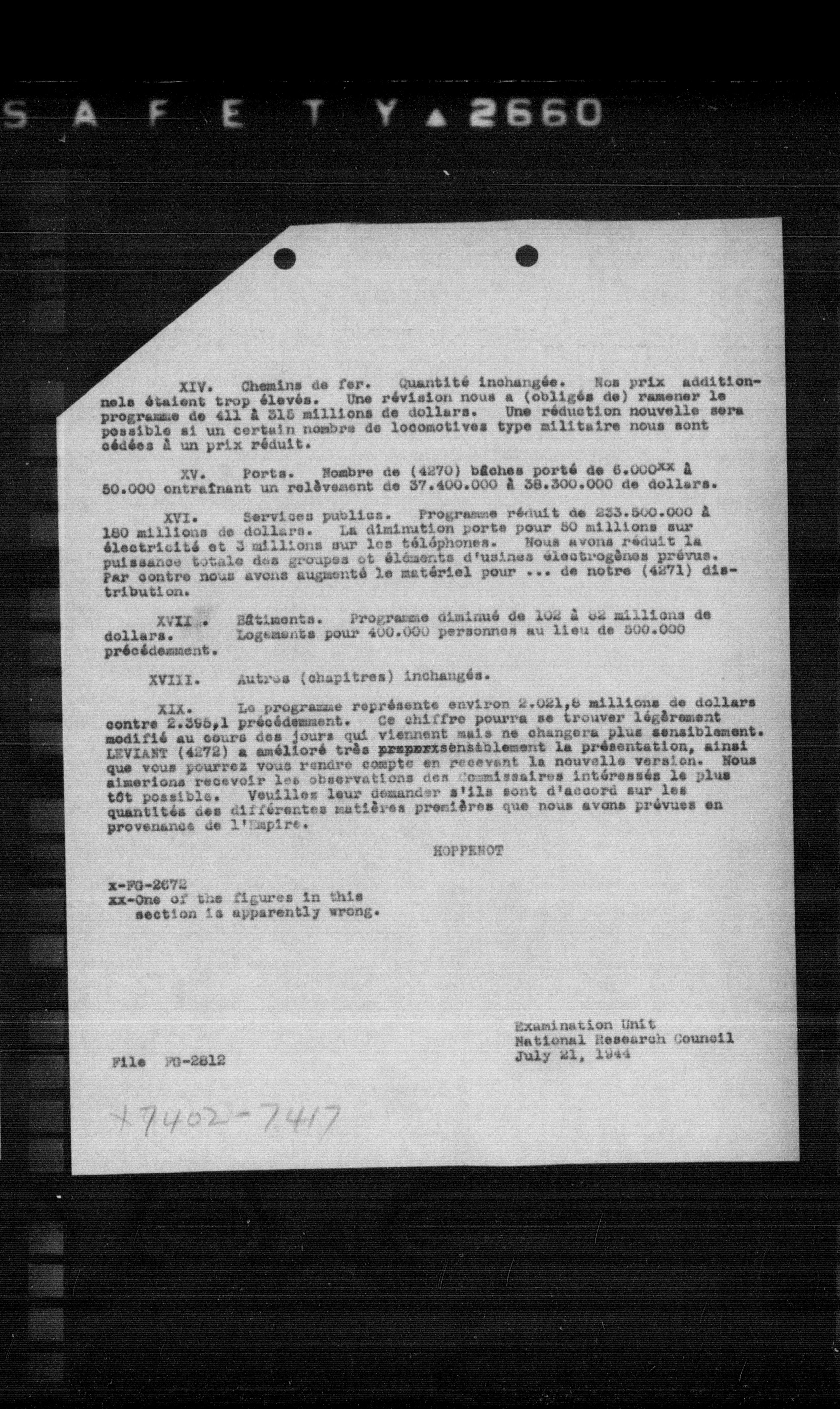 **XIV.** Chemin de fer. Quantité inchangée. Nos prix additionnels étaient trop élevés. Une révision nous a (obligés de) ramener le programme de 411 à 315 millions de dollars. Une réduction nouvelle sera possible si un certain nombre de locomotives type militaire nous sont cédées à un prix réduit.