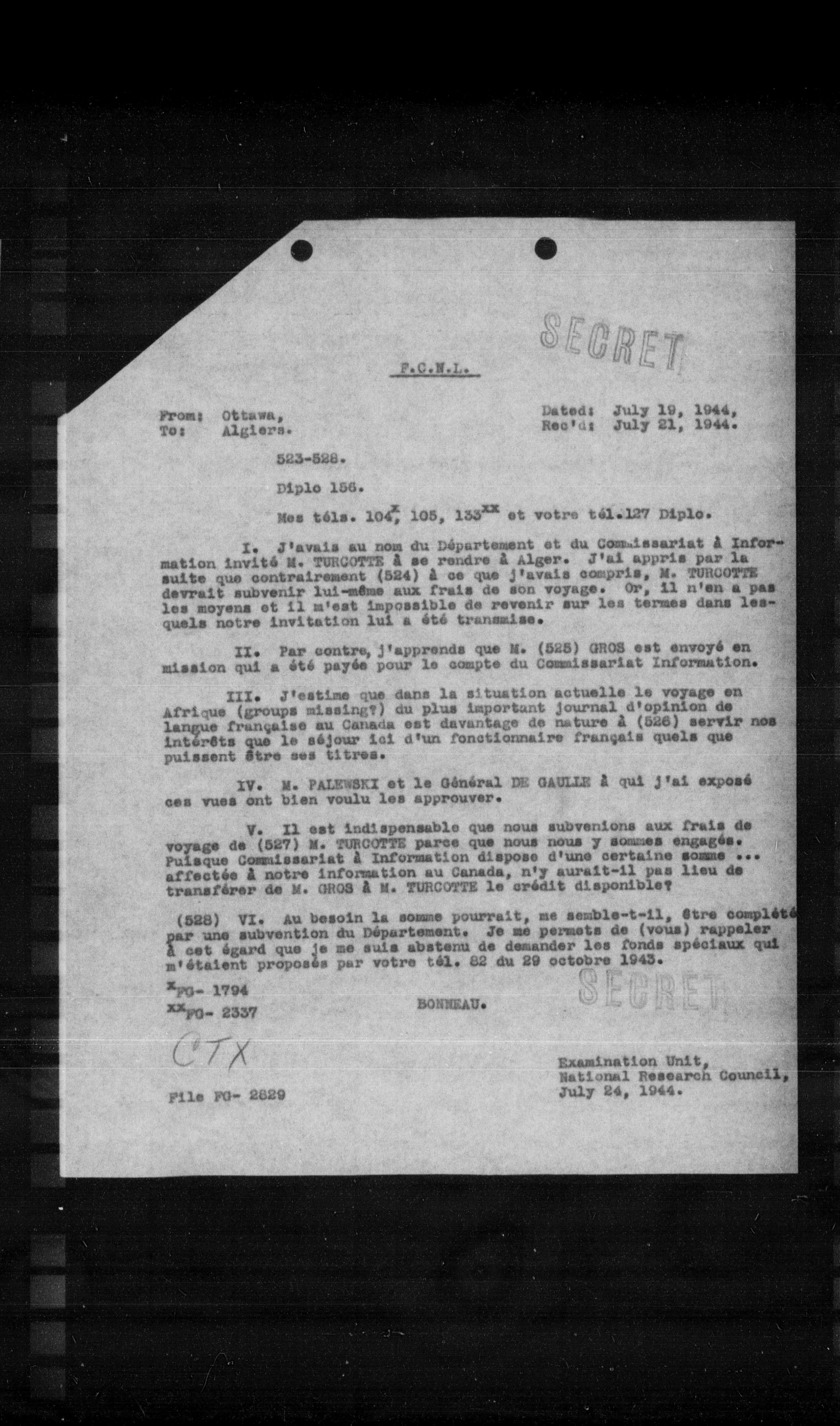 I. J'avais au nom du Département et du Commissariat à Information Invité M. TURCOTTE à se rendre à Alger. J'ai appris par la suite que contrairement (524) à ce que j'avais compris, M. TURCOTTE devrait subvenir lui-même aux frais de son voyage. Or, il n'en a pas les moyens et il m'est impossible de revenir sur les termes dans lesquels notre invitation lui a été transmise.