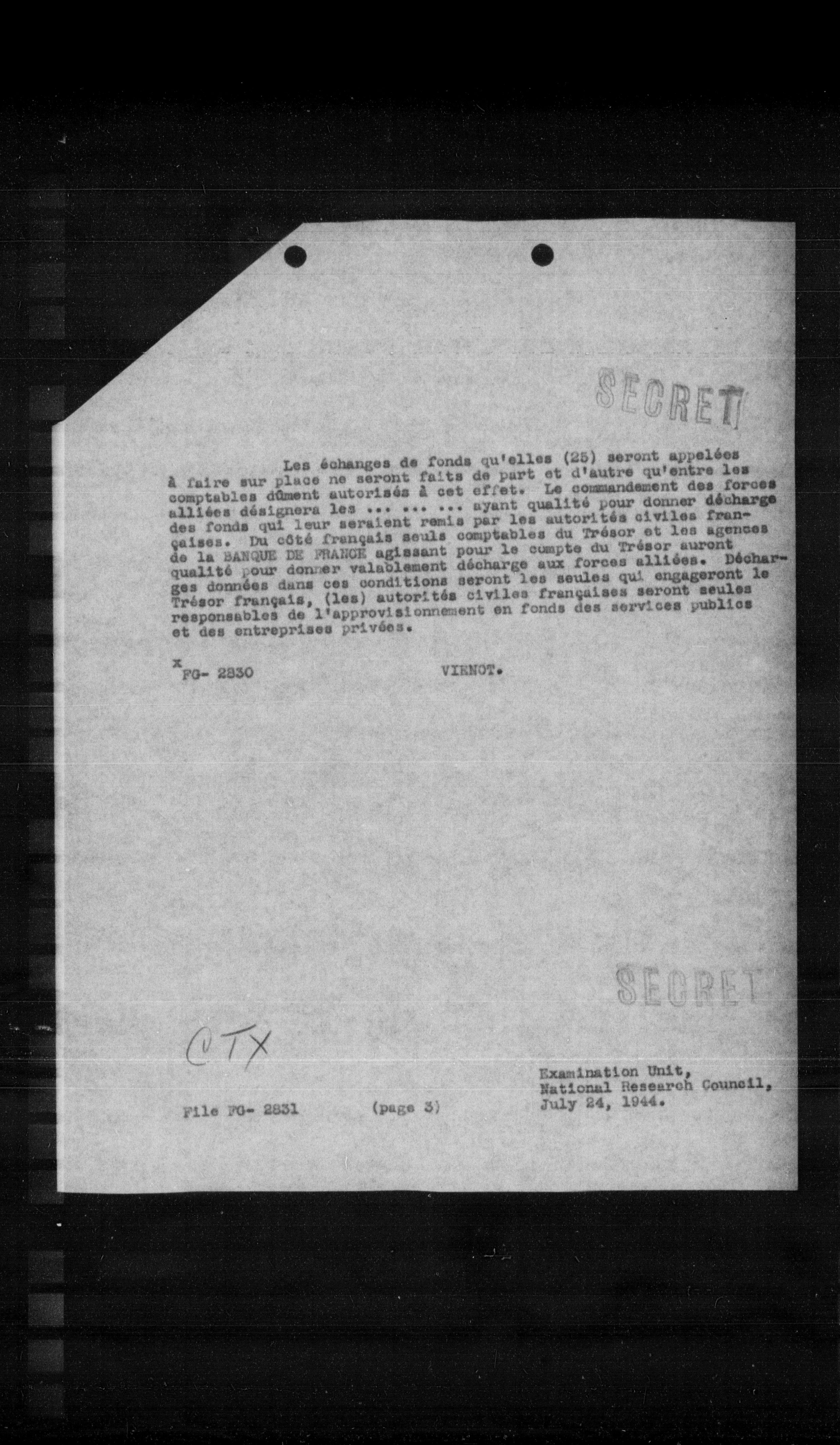 à faire sur place ne seront faits de part et d'autre qu'entre les comptables cûment autorisés à cet effet. Le commandement des forces alliées désignera les ...... ayant qualité pour donner décharge des fonds qui leur seraient remis par les autorités civiles françaises. Du côté français seuls comptables du Trésor et les agences de la SARGUE DE FRANCE agissant pour le compte du Trésor auront qualité pour donner valablement décharge aux forces alliées. Déchargez données dans ces conditions seront les seules qui engageront le Trésor français, (les) autorités civiles françaises seront seules responsables de l'approvisionnement en fonds des services publics et des entreprises privées.